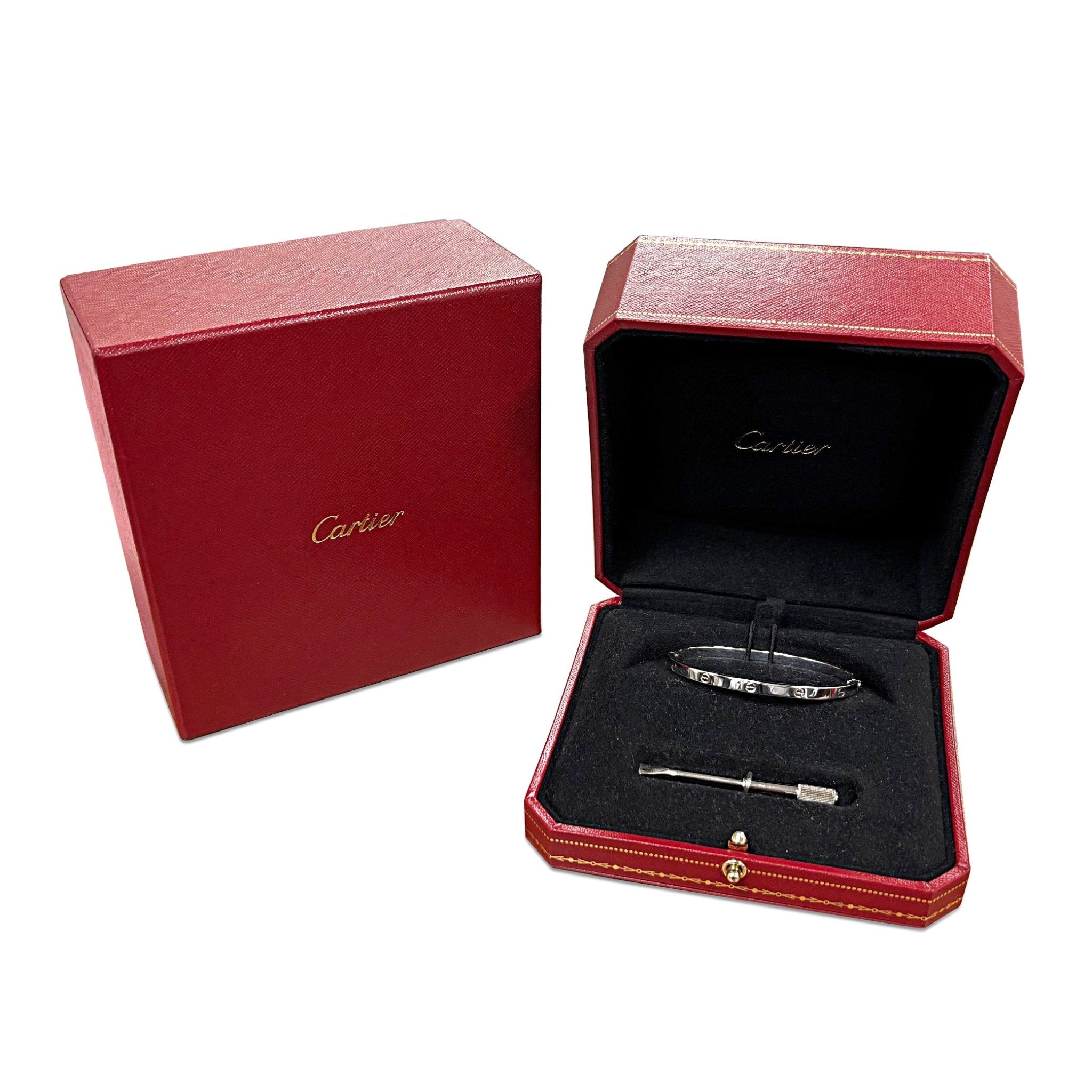 This pre-owned Cartier Love Bangle Small Model 18ct White Gold - Size 16 on your wrist and feel the weight of love and luxury. Make a statement and be the envy of all with this exquisite bracelet from the Love collection. Trust us, you won't want to take it off.