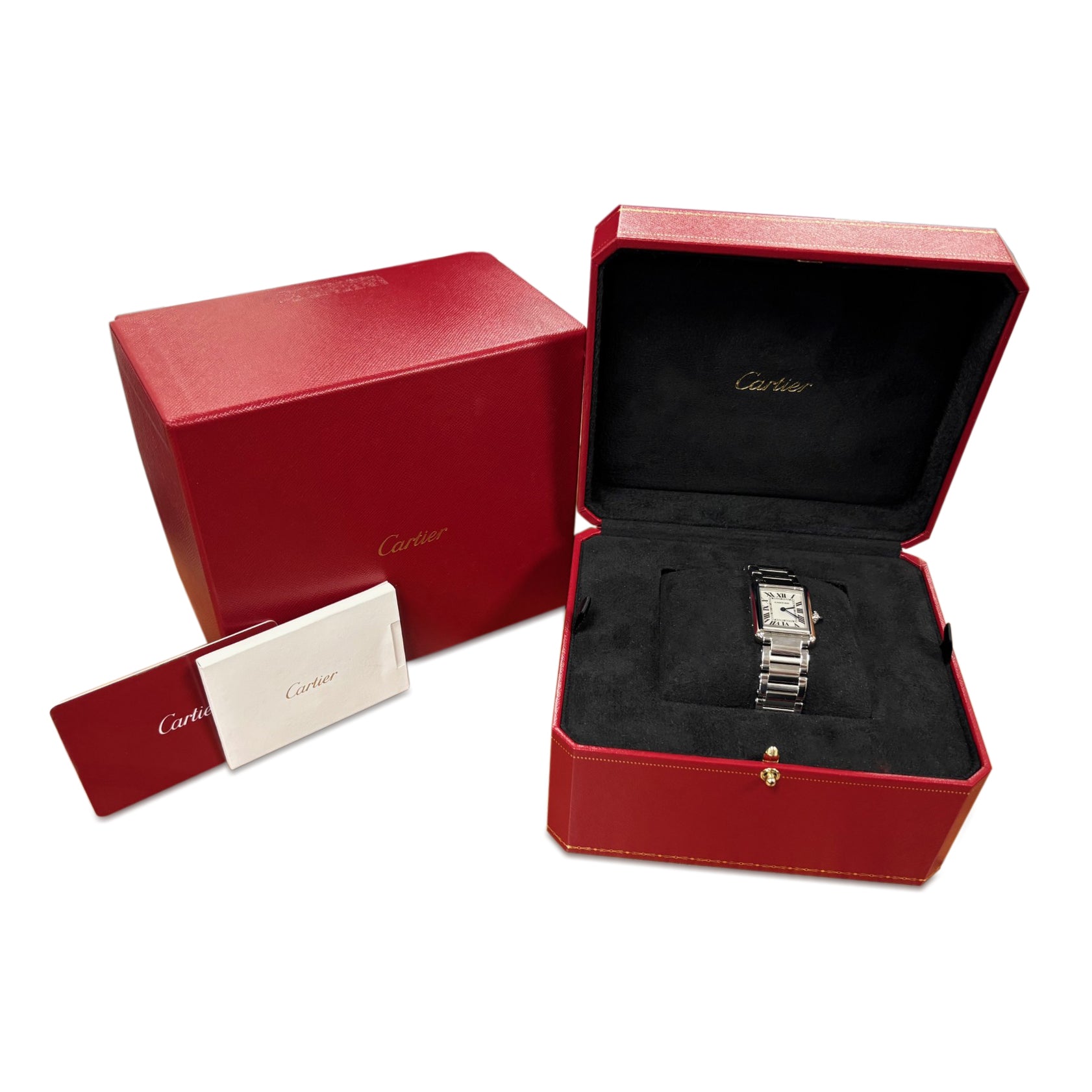 As a bonus, this exquisite timepiece comes with its original Box and Papers, adding to its value and authenticity. It's not just a watch, it's an experience. From the sleek design to the flawless craftsmanship, every aspect of this used Cartier Tank De Cartier Small Model Quartz Watch Ref WSTA0051 exudes luxury and exclusivity. So why settle for ordinary when you can have extraordinary? Elevate your style and make a statement with the Cartier Tank De Cartier – a timeless piece for the modern woman.