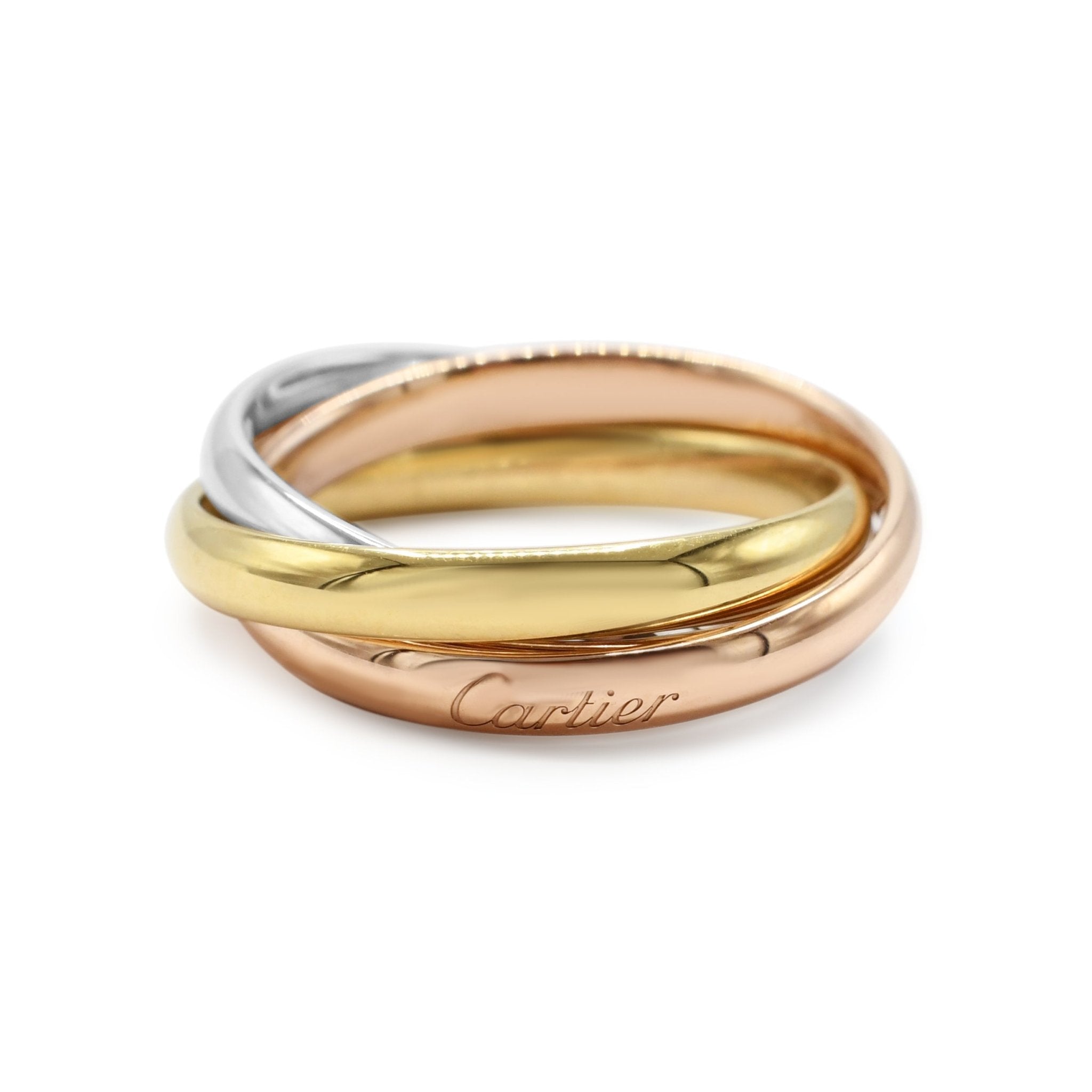 Introducing this second hand Cartier Three Colour Trinity Ring - a true masterpiece in the world of luxury jewellery. This stunning ring features a perfect blend of 18ct Yellow, White, and Rose Gold, creating a unique and elegant tri-colour design that will make heads turn.