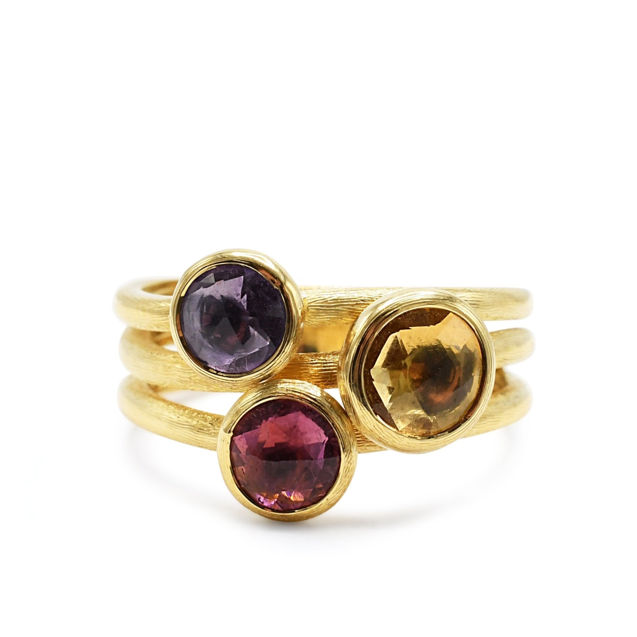 Crafted with meticulous attention to detail, this pre-owned ring is a sight to behold. Each Stone is hand-picked, ensuring the brilliance of the natural Gemstones - Amethyst Citrine, Tourmaline. These vibrant and colourful stones are perfectly complemented by the rich band, creating a harmonious and eye-catching piece of jewellery.