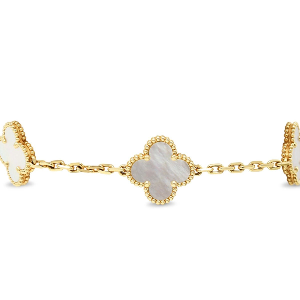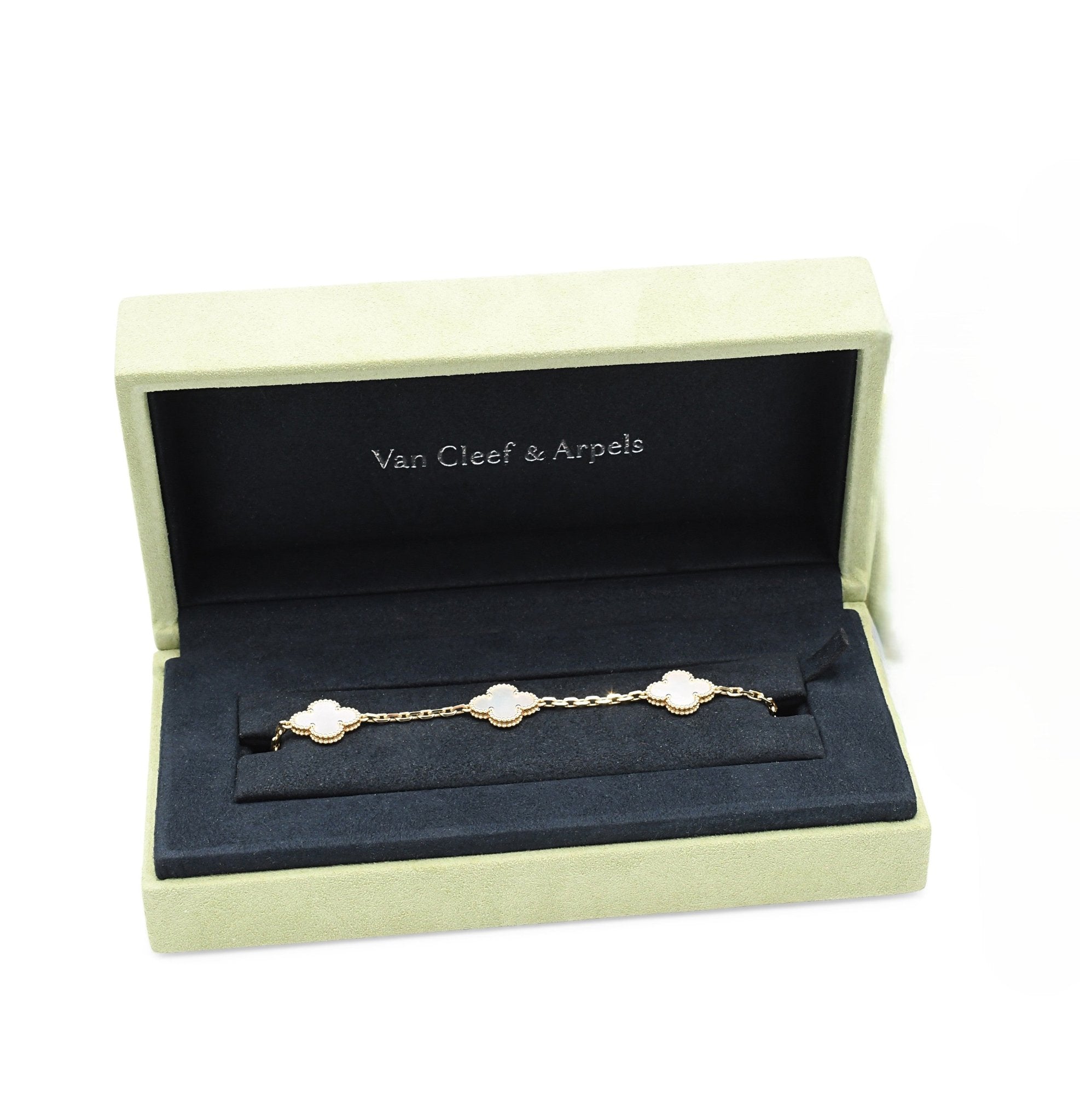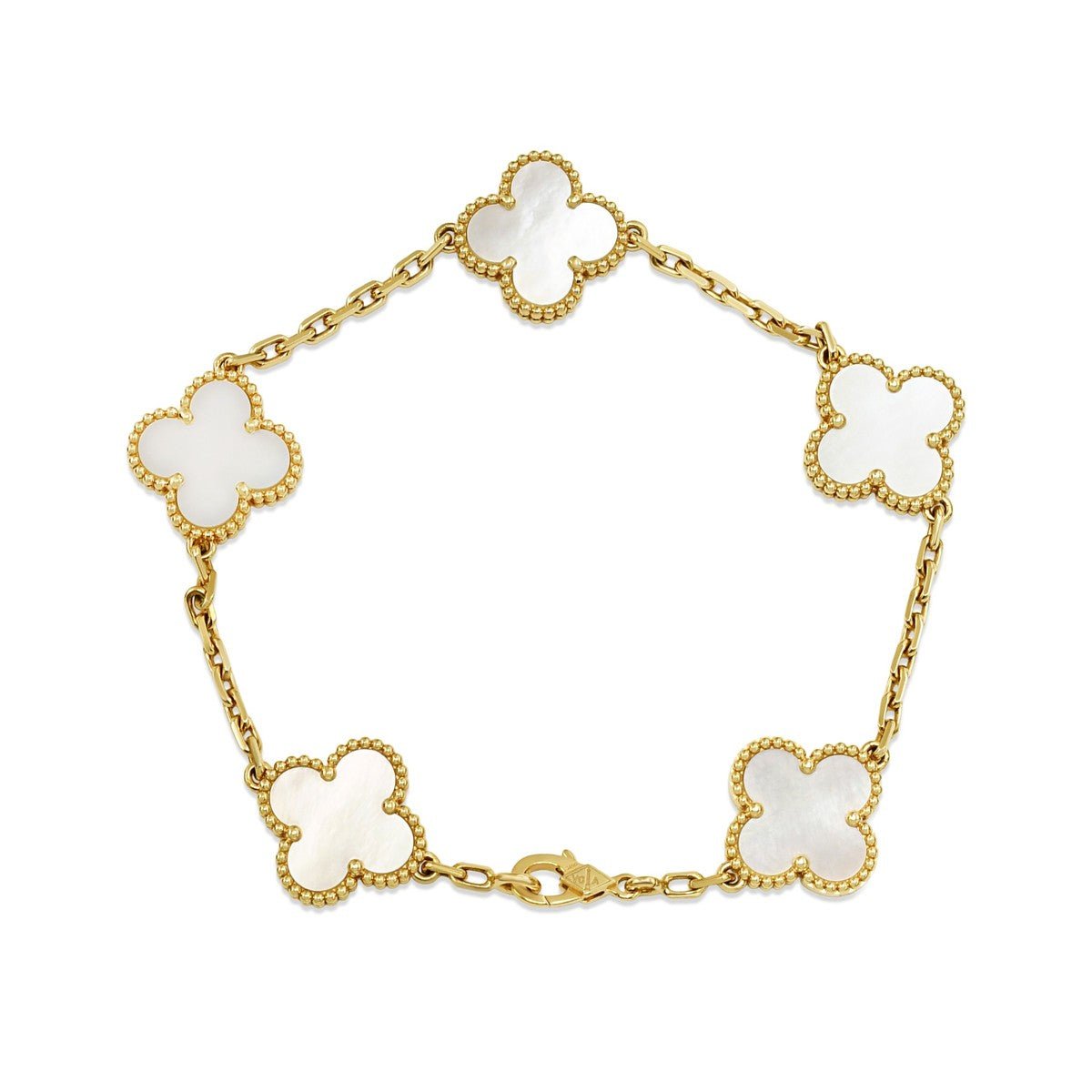 Embrace timeless elegance with this exquisite Van Cleef & Arpels Vintage Alhambra bracelet, crafted in lustrous 18ct yellow gold. Featuring five delicate mother-of-pearl motifs, each piece captures the iconic clover design that defines the maison's heritage of refined luxury.
