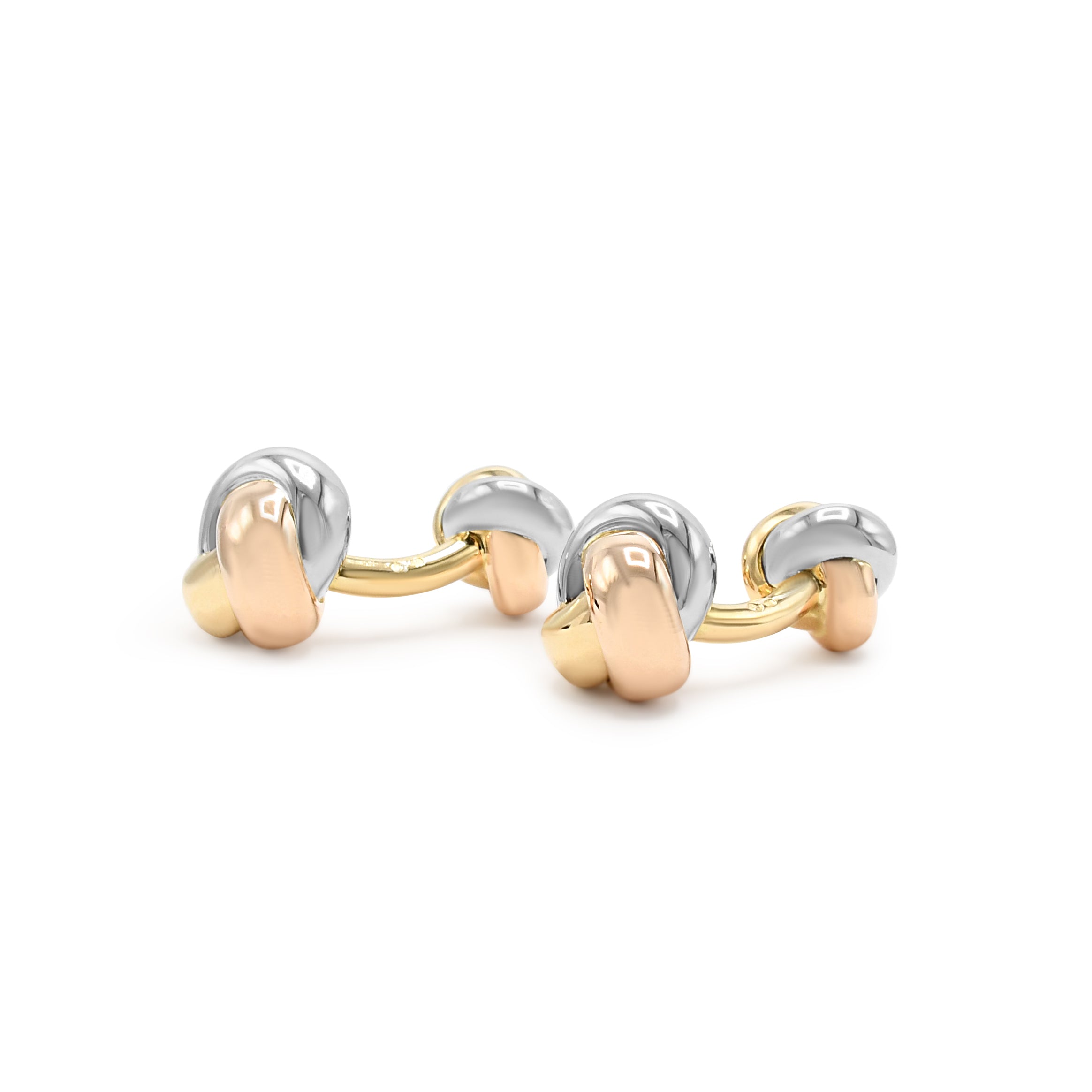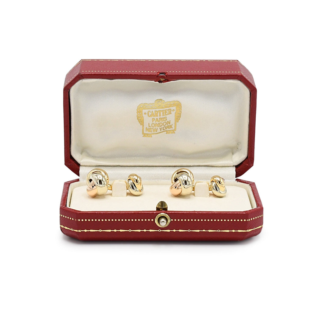 Introducing the ultimate epitome of luxury and sophistication: these second hand Cartier Trinity Cufflinks in 18ct Three Colour Gold. Designed exclusively for men, these magnificent cufflinks are a must-have accessory for any gentleman looking to elevate his style. Crafted by the renowned brand Cartier, these cufflinks are a masterpiece and a symbol of class and elegance.