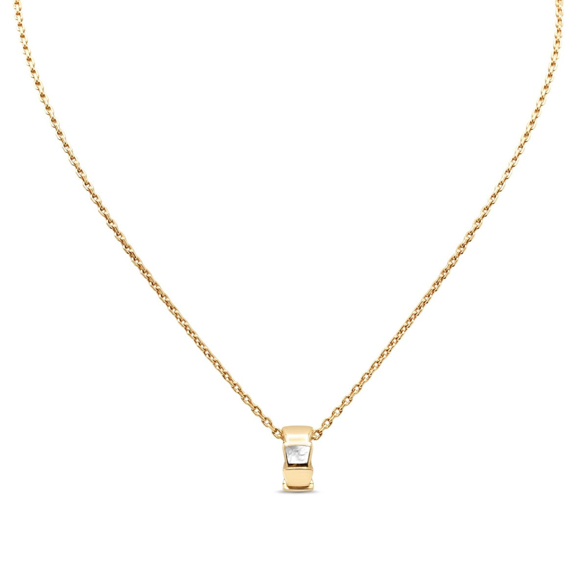 The iconic serpent design features a stunning mother of pearl stone, capturing light with every movement. Measuring 40cm in length with a delicate pendant of 13mm height and 6mm width, this piece offers refined elegance for everyday wear or special occasions. Weighing just 11.48g, it sits beautifully against the skin.