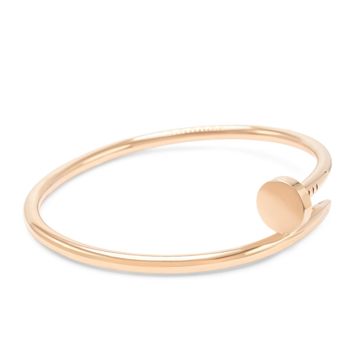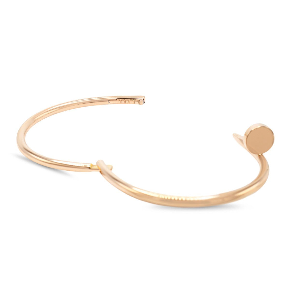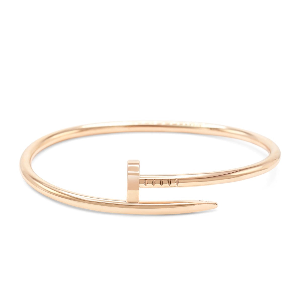 The iconic Cartier Juste un Clou bangle in 18ct rose gold—a timeless design that transcends gender and style. This unisex bracelet features the collection's signature nail-inspired motif, crafted with precision and elegance.
