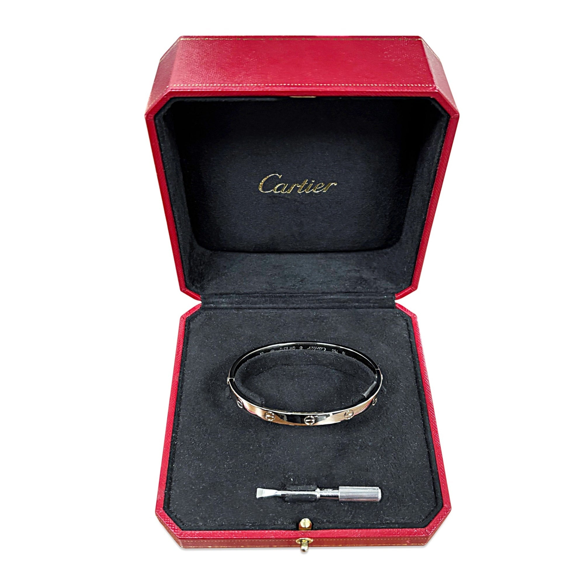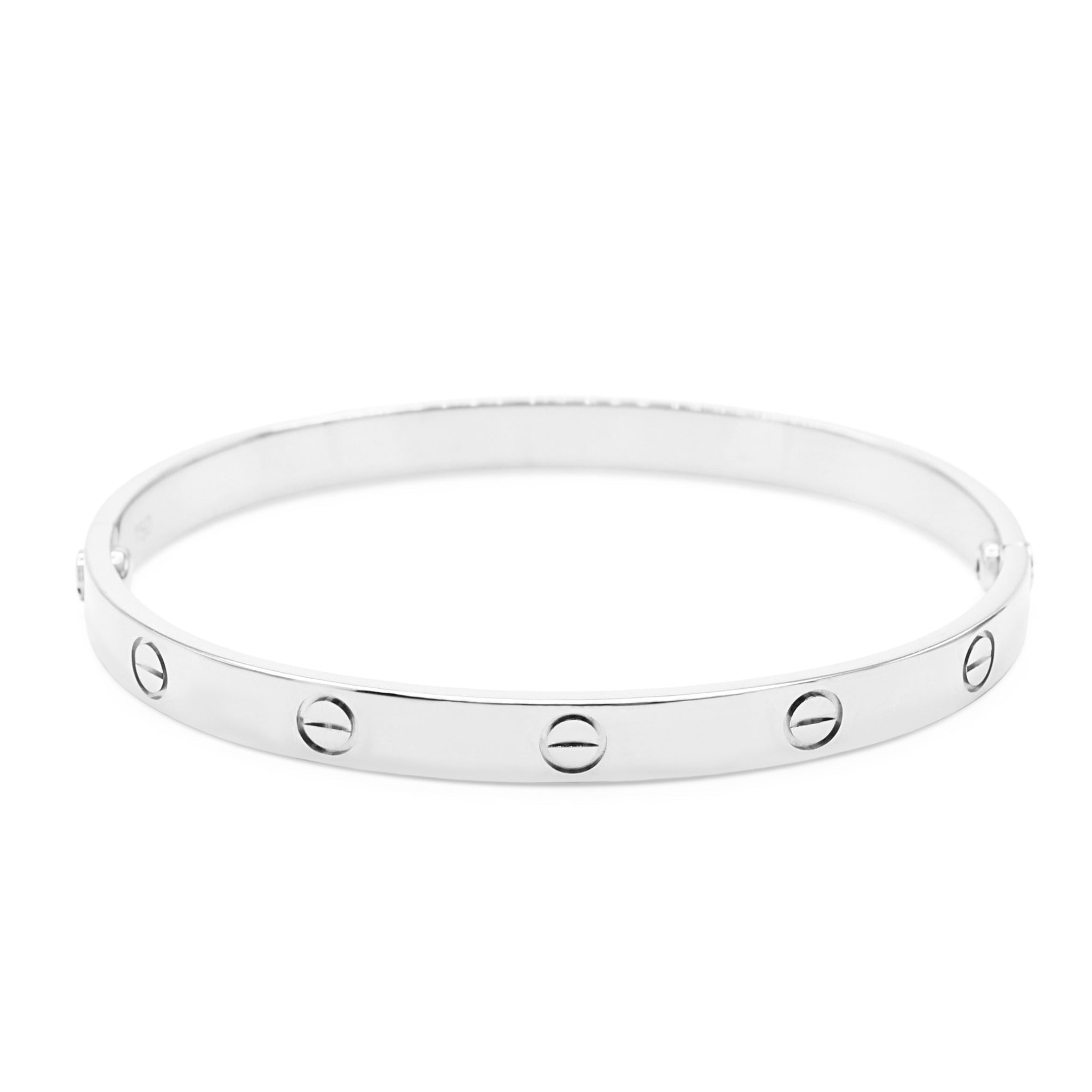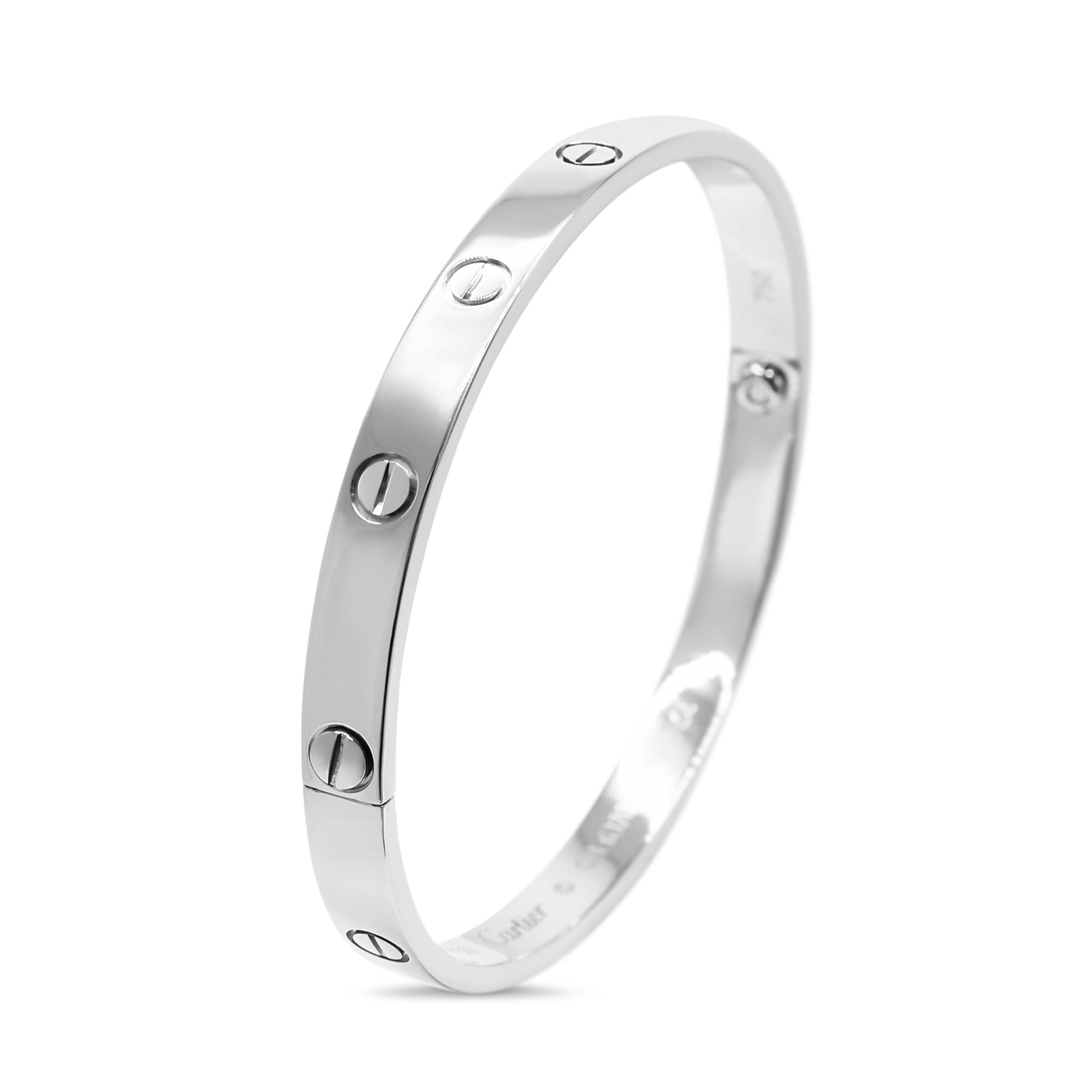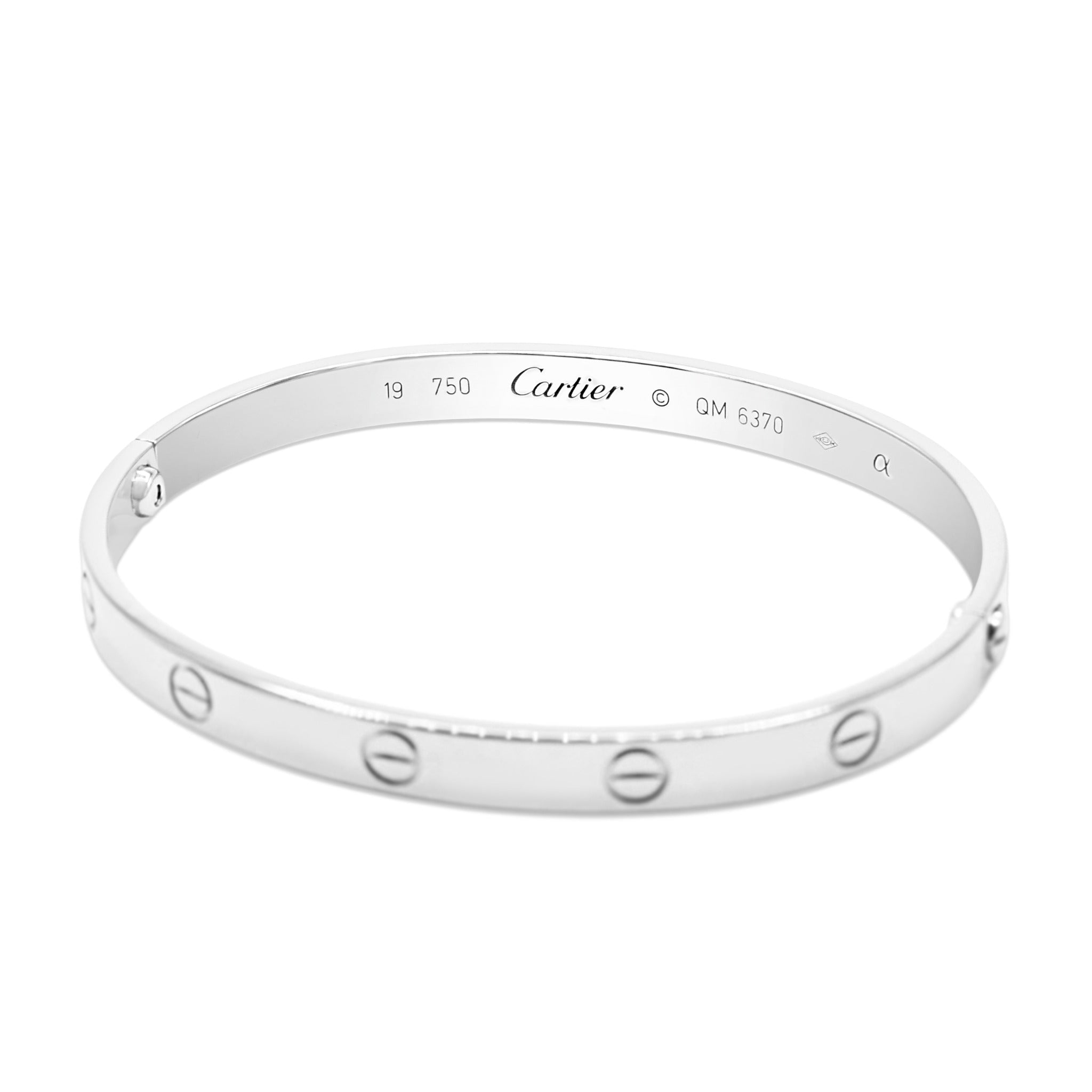 The iconic Cartier Love bangle in 18ct white gold, a timeless symbol of devotion and elegance. This size 19 bracelet showcases the collection's signature design with its distinctive screw motif, crafted from precious white gold and weighing 36.9g.