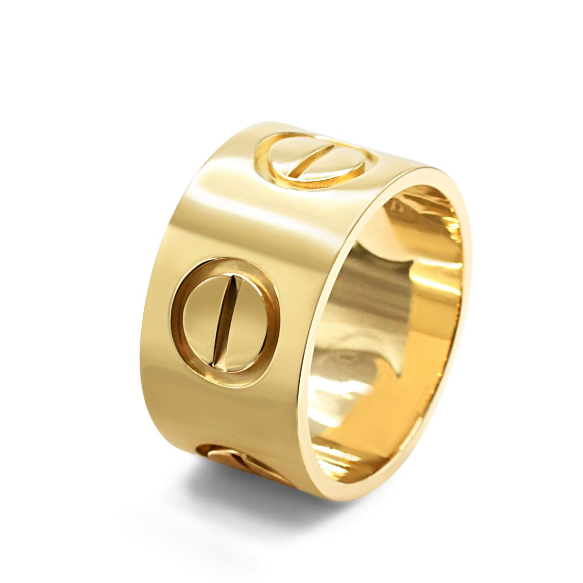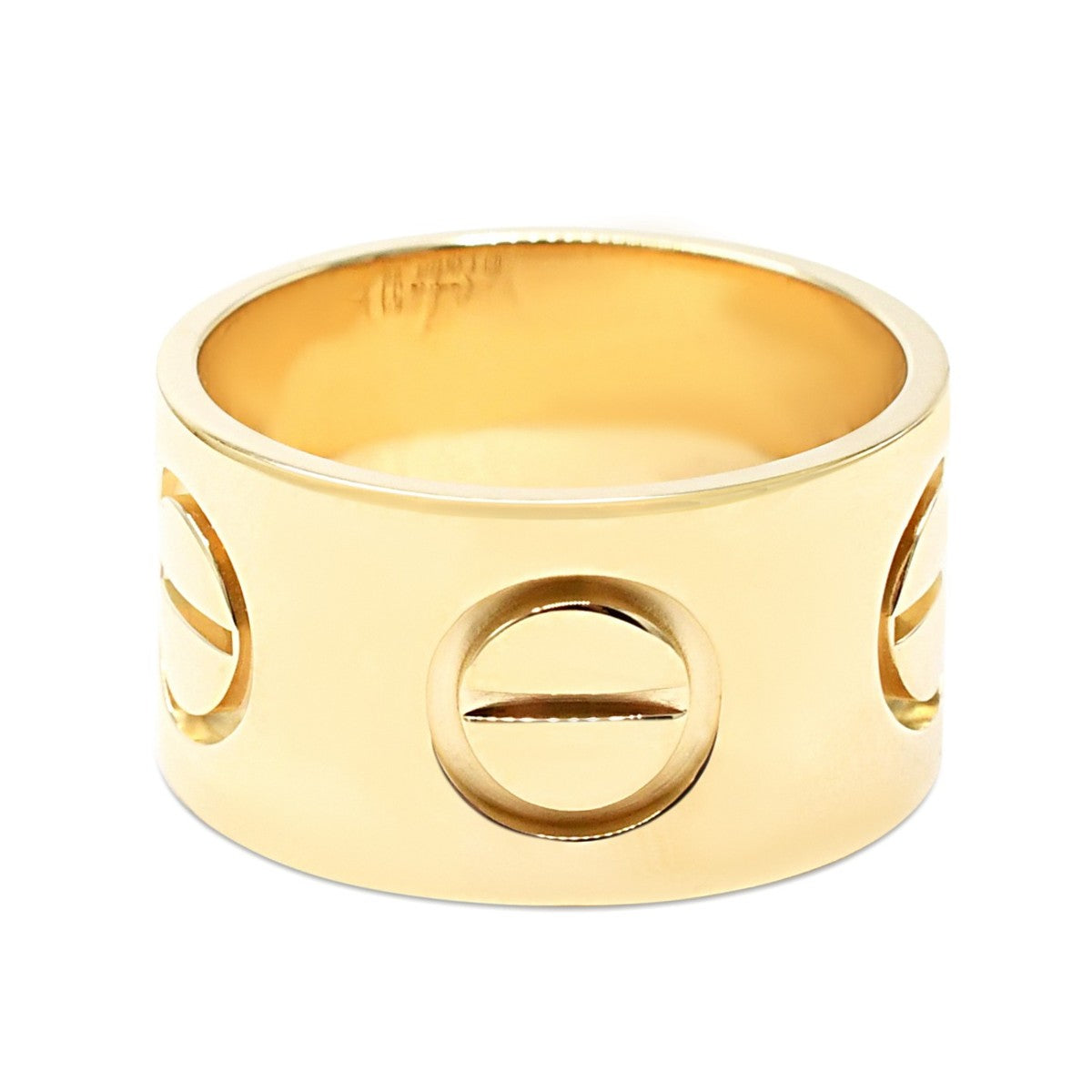 Iconic Cartier Love Ring crafted in 18ct yellow gold, featuring the signature 10.5mm band width. This timeless unisex design represents eternal commitment with its distinctive screw motif detail.