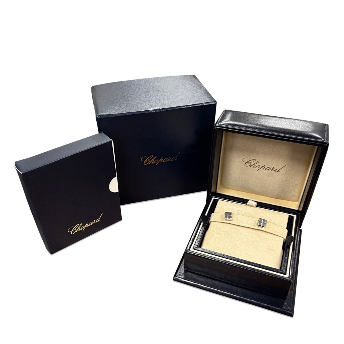 Each earring is inscribed with "Chopard 750," confirming authentic craftsmanship. Weighing 6.1g in total, they offer a substantial yet comfortable wear. Presented in an official Chopard box, making them an ideal gift for the discerning jewellery lover. Model Reference: 83/4100