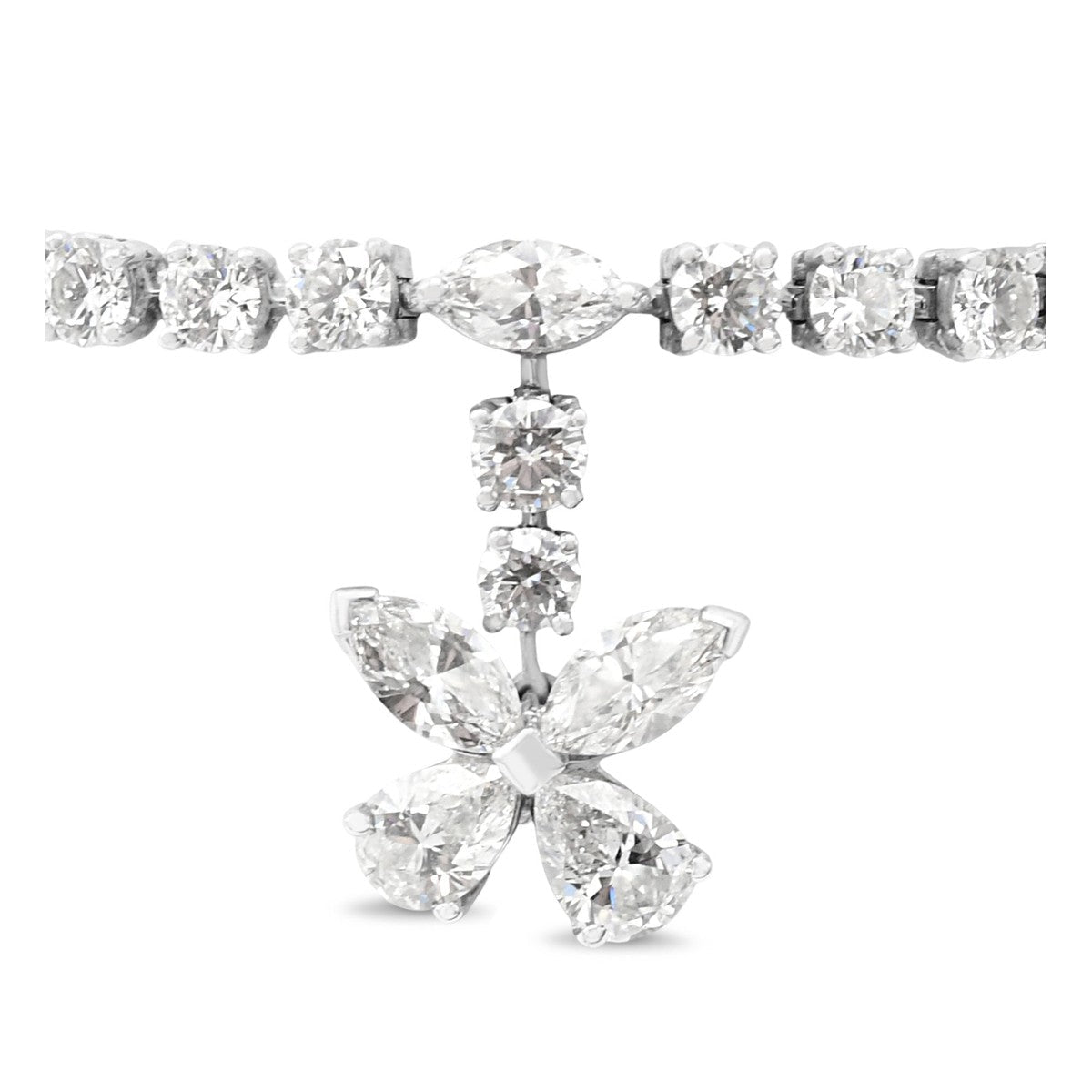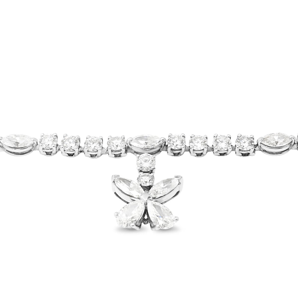 This exquisite Graff bracelet showcases masterful diamond craftsmanship with a total of approximately 7.4 carats of premium stones. The design features twenty-five brilliant cut diamonds complemented by eight marquise cuts and two elegant pear cuts, creating a sophisticated interplay of light and sparkle. Each diamond is graded D-F in colour with VVS1-VS1clarity, representing exceptional quality.