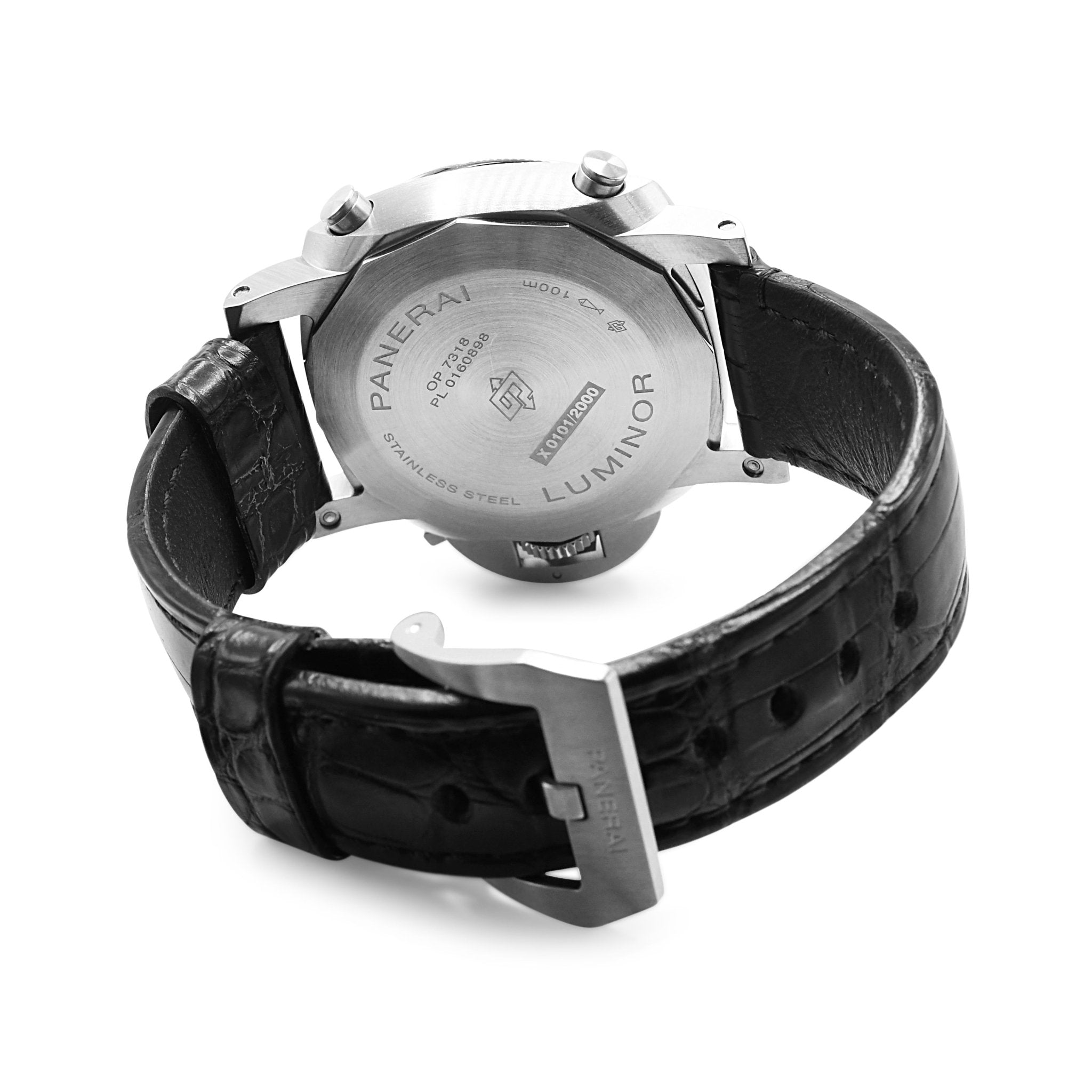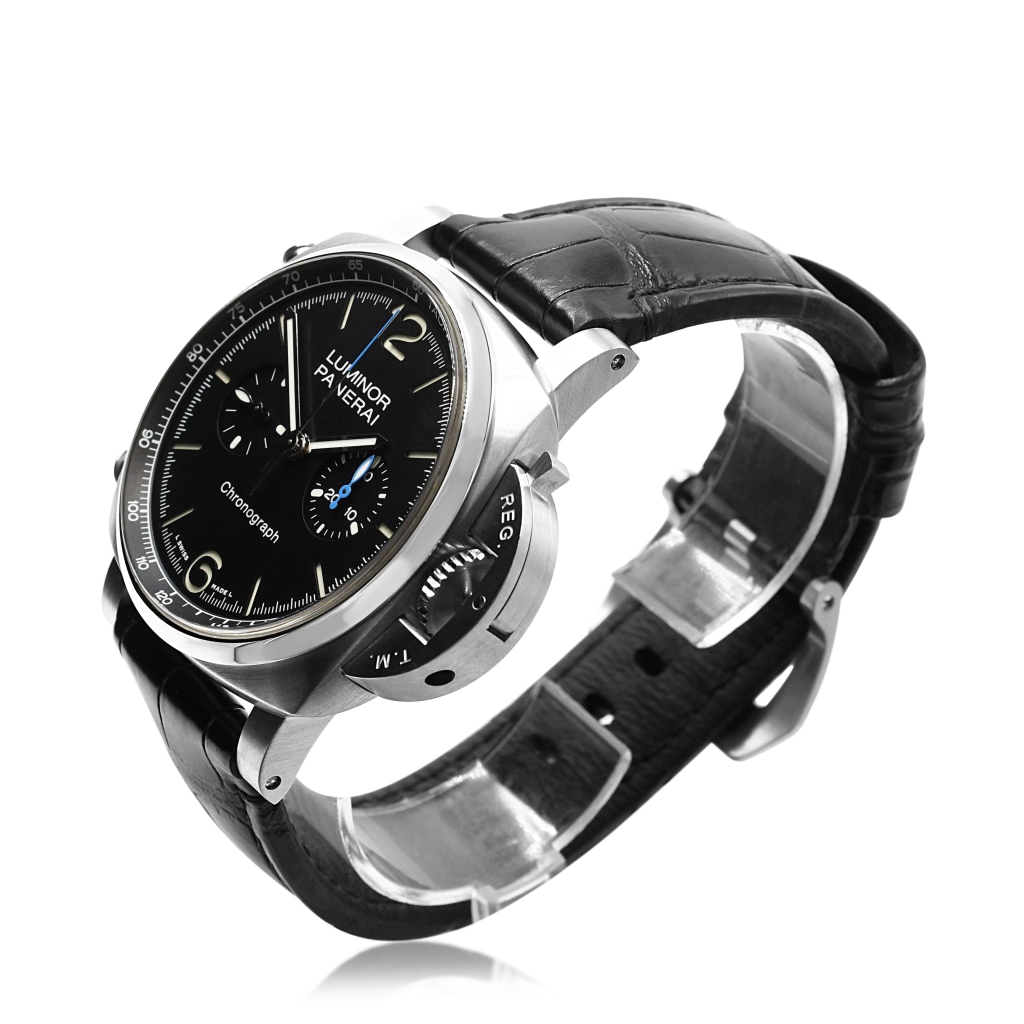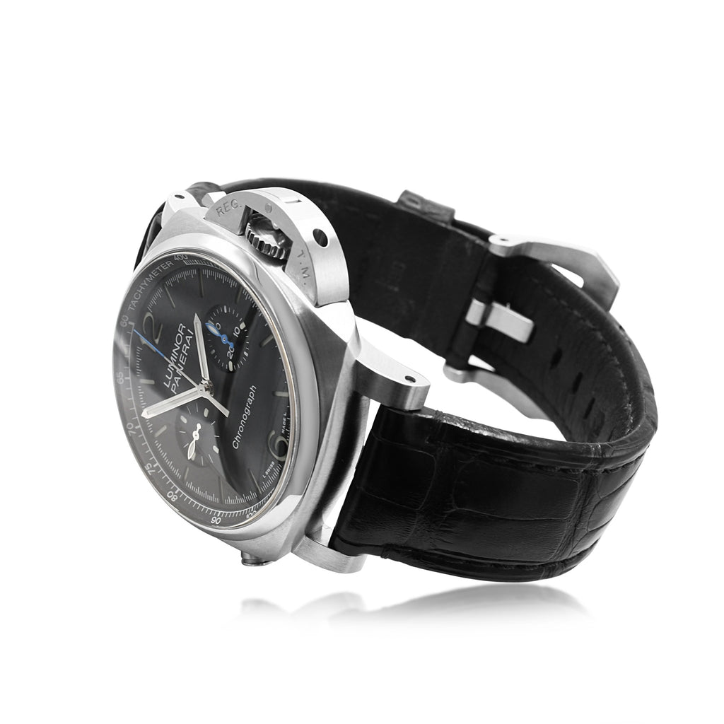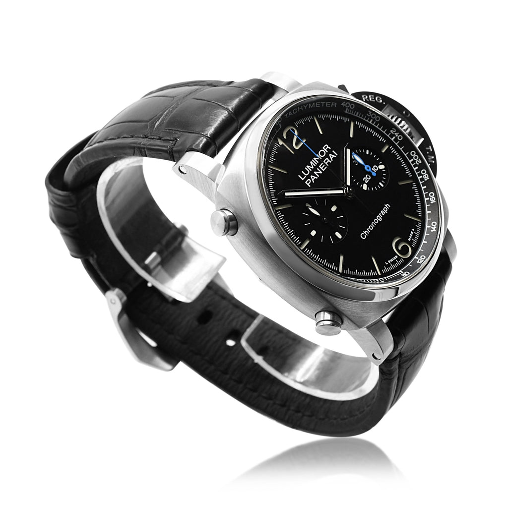 Introducing this second hand Panerai Luminor 44mm Chronograph Strap Watch, the pinnacle of luxury and sophistication in the world of watches. Crafted by the esteemed brand Panerai, this timepiece is the perfect combination of elegance, precision, and functionality, making it a must-have for any watch connoisseur or stylish gentleman.