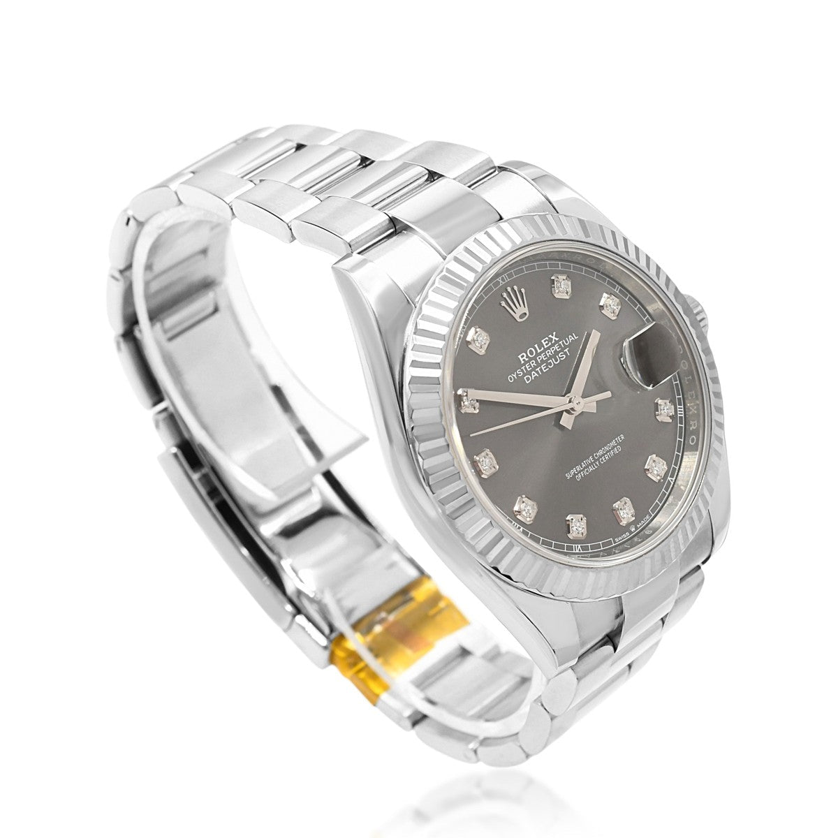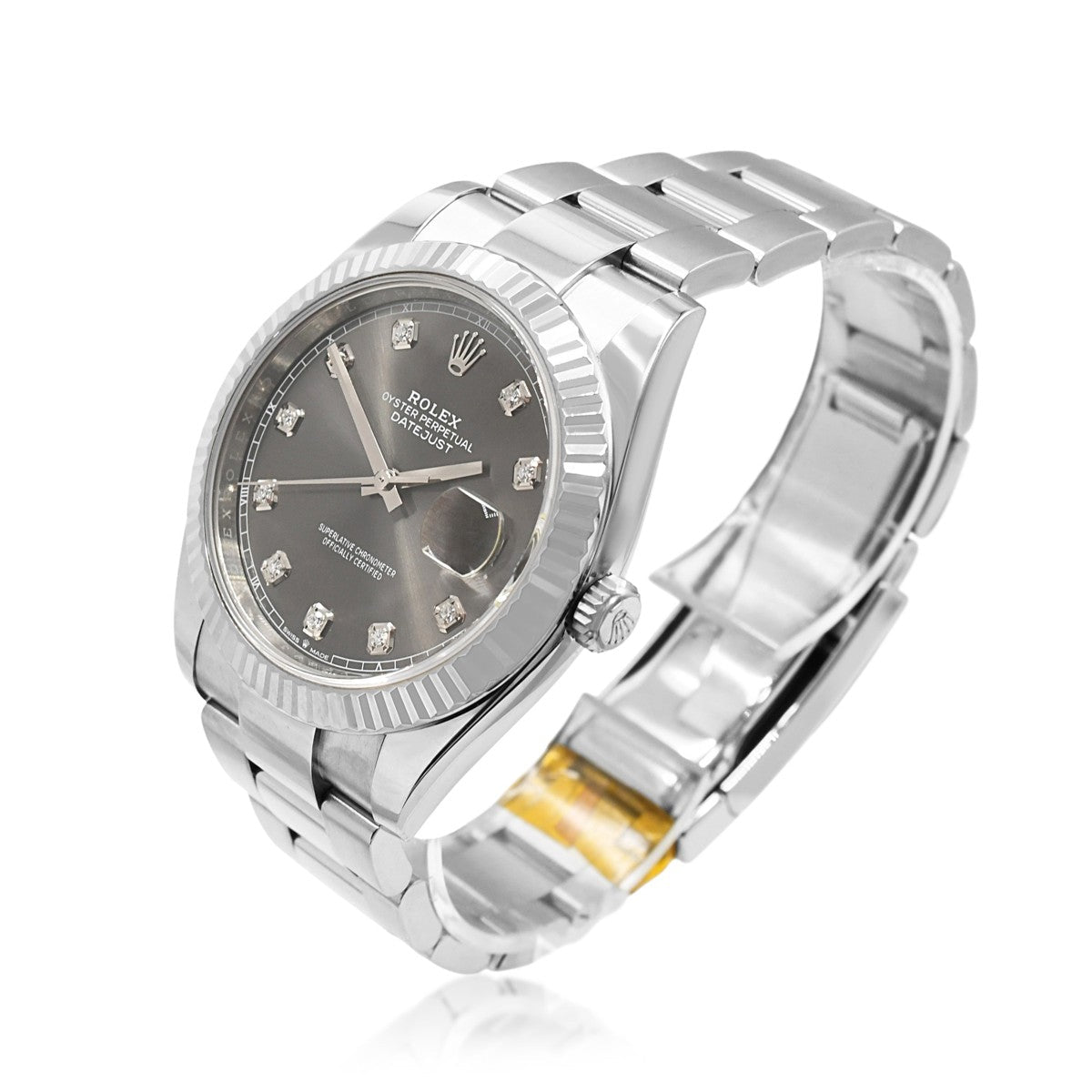 This exceptional Rolex Datejust 41mm combines the timeless elegance of 18ct white gold with robust Oystersteel, creating a striking two-tone timepiece. The sophisticated grey diamond dot dial adds refined character to this iconic model reference 126334.
