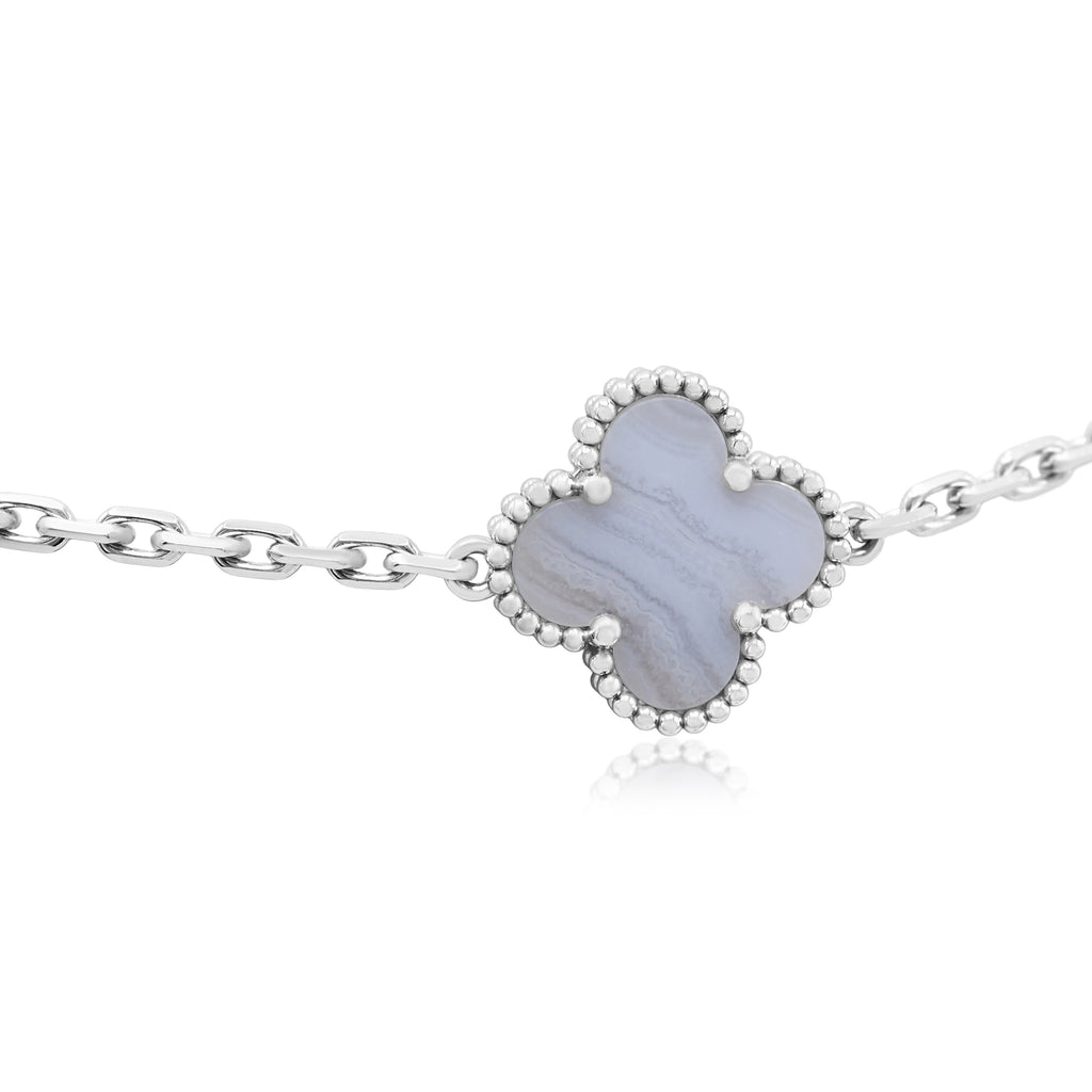 As you hold this necklace in your hand, you can feel the weight of its 18ct White Gold chain and 20 stunning Chalcedony motifs. Each motif is meticulously handcrafted, showcasing the brand's expertise in Gemstone cutting and setting. The soft blue hue of the Chalcedony exudes a sense of tranquility and sophistication, making it the perfect accessory for any occasion.