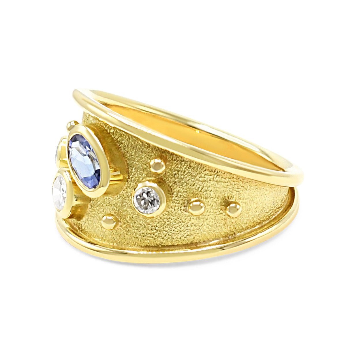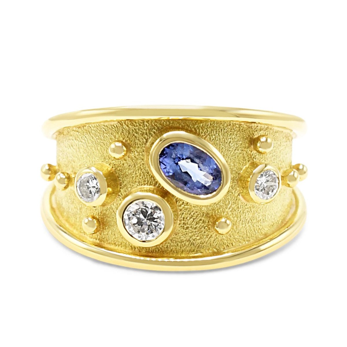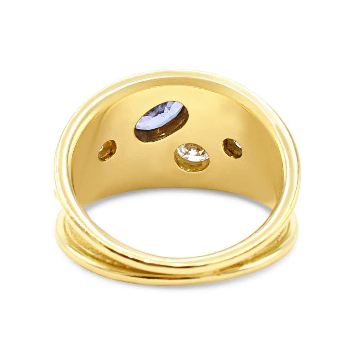 Elevate your jewellery collection with this exquisite Leo De Vroomen design, crafted in lustrous 18ct yellow gold. This sophisticated ring features a stunning tanzanite gemstone (approximately 0.22cts) complemented by sparkling diamonds totalling approx imately 0.32cts, creating a captivating interplay of colour and brilliance. The thoughtfully tapered band—13.3mm at its widest point, narrowing to 2.5mm—offers both presence and comfort.
