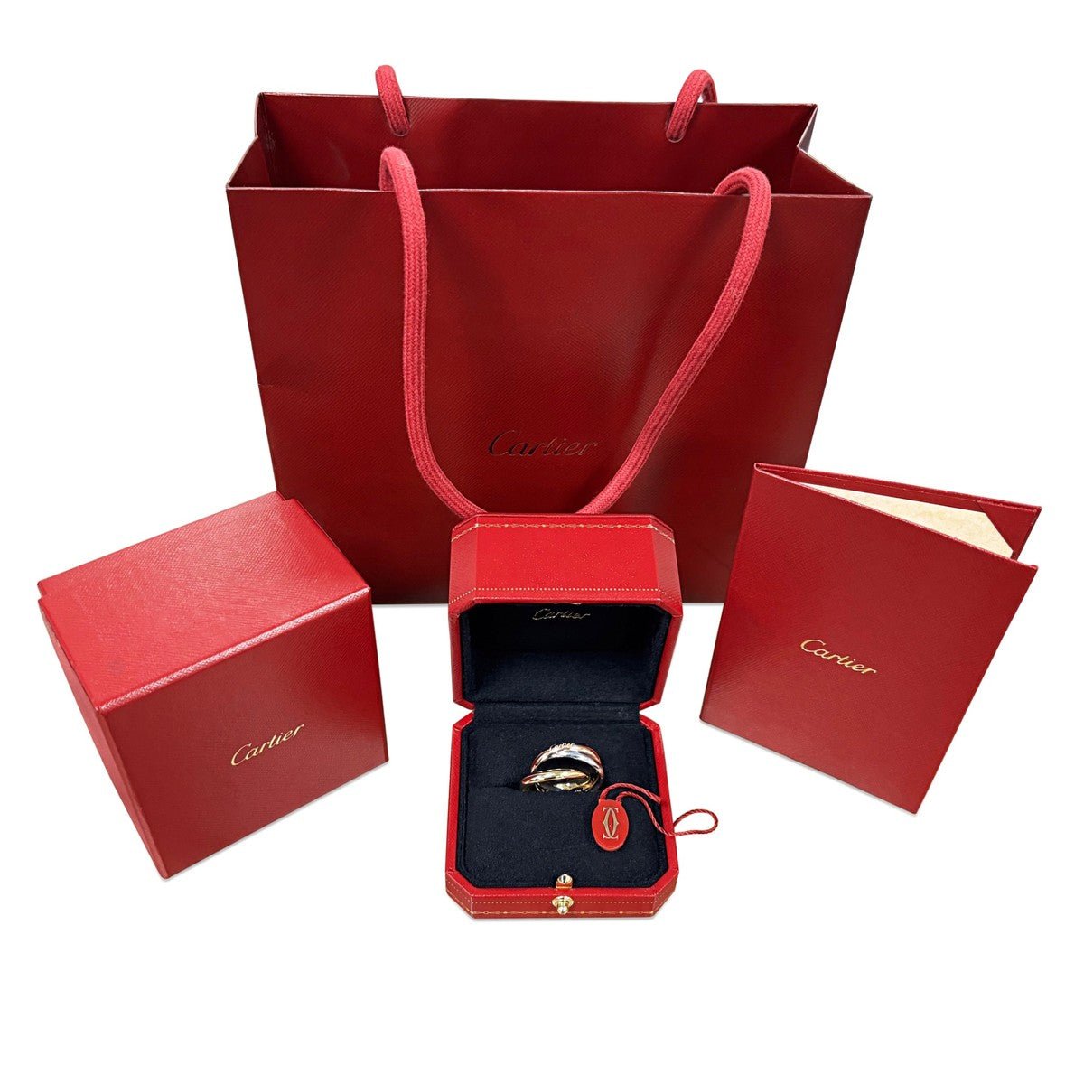 This iconic Cartier Trinity ring showcases the brand's signature three-colour gold design, crafted from 18ct gold in a harmonious blend of white, yellow, and rose tones.