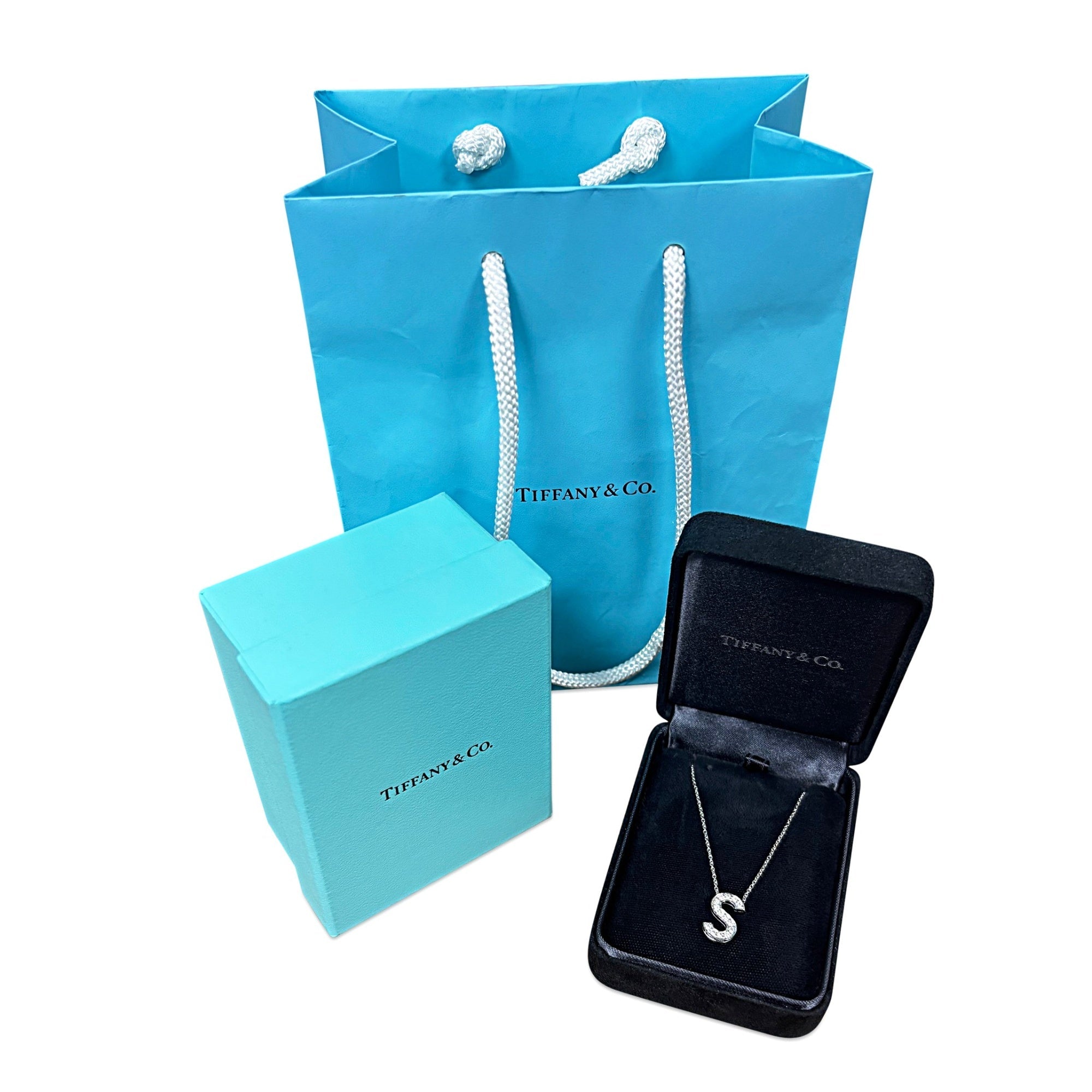 Elevate your jewellery collection with this exquisite Tiffany & Co diamond initial pendant, a timeless piece from 2007. Crafted in platinum (PT950), this delicate 'S' pendant features genuine diamonds and measures 13 x 8mm, suspended on a graceful 48cm necklace.