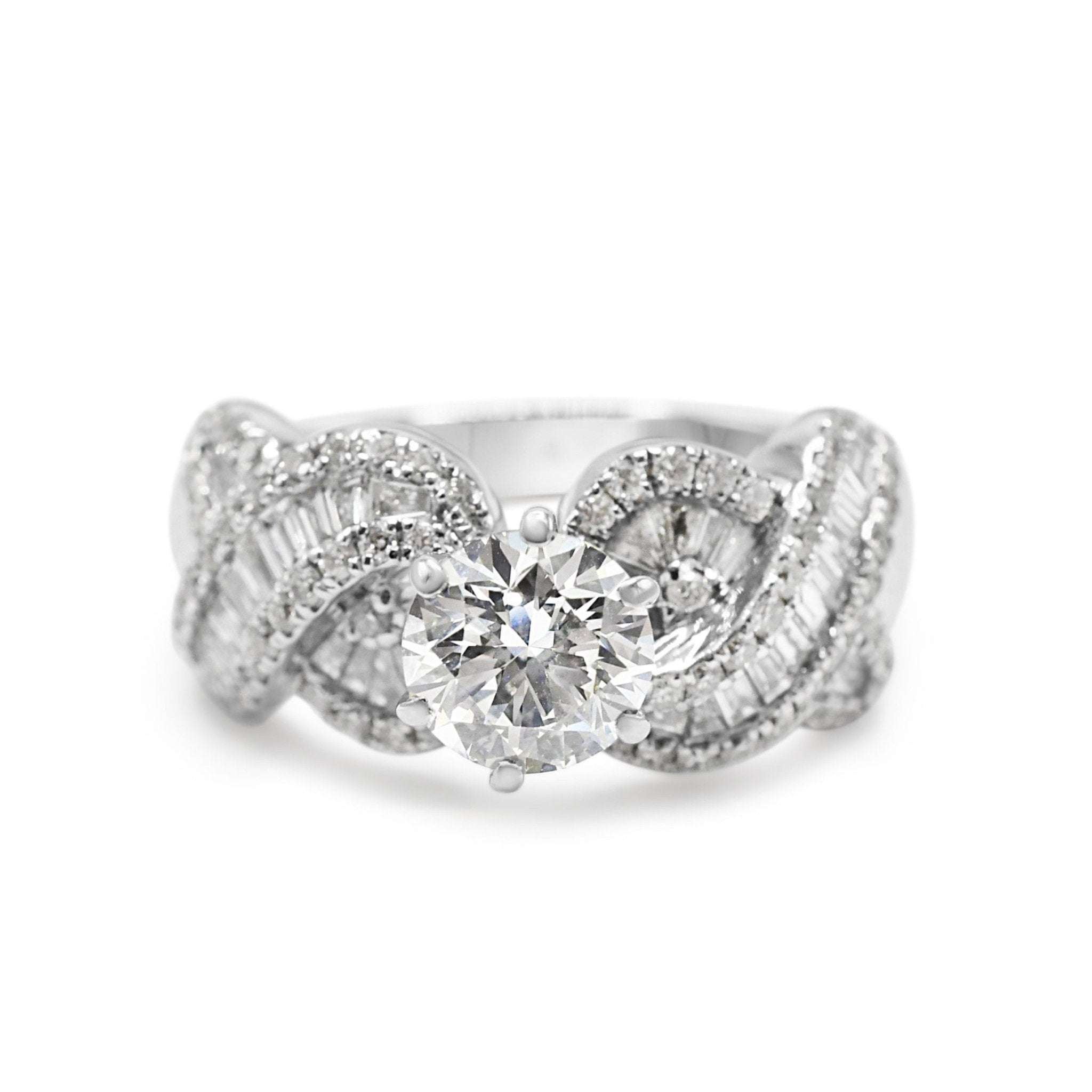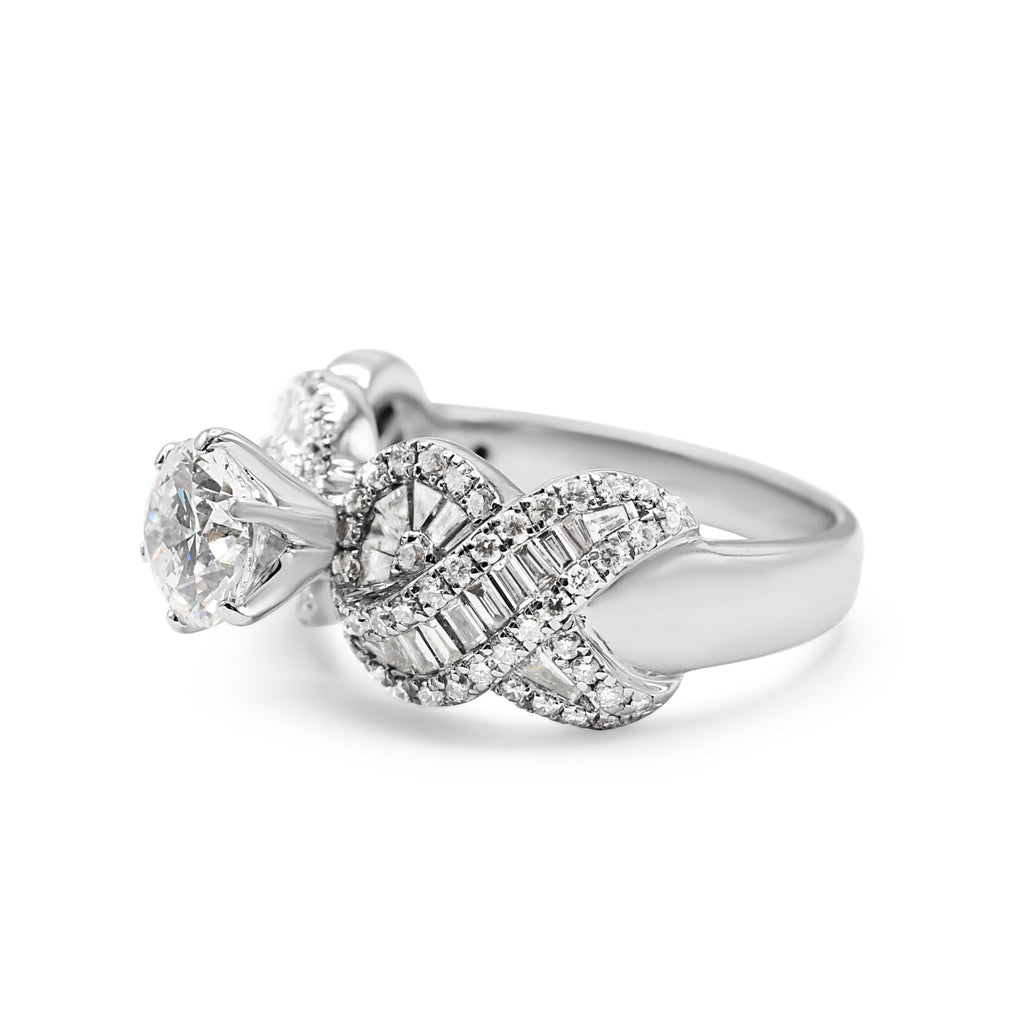 Crafted to perfection, this pre-owned ring is the epitome of elegance and luxury. The stunning Round Brilliant and Baguette Cut Diamonds are carefully set in a perfect harmony, radiating an aura of sophistication and glamour. The 1.03ct centre stone and 1.34ct Diamond shoulders give this ring an impressive total weight, making it a showstopper.