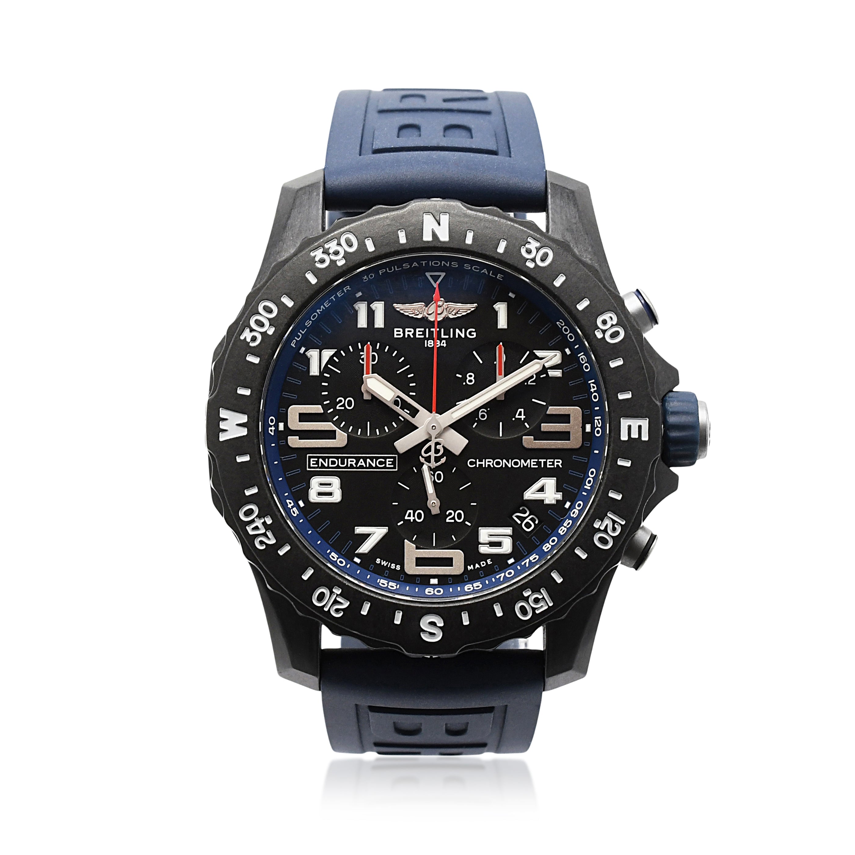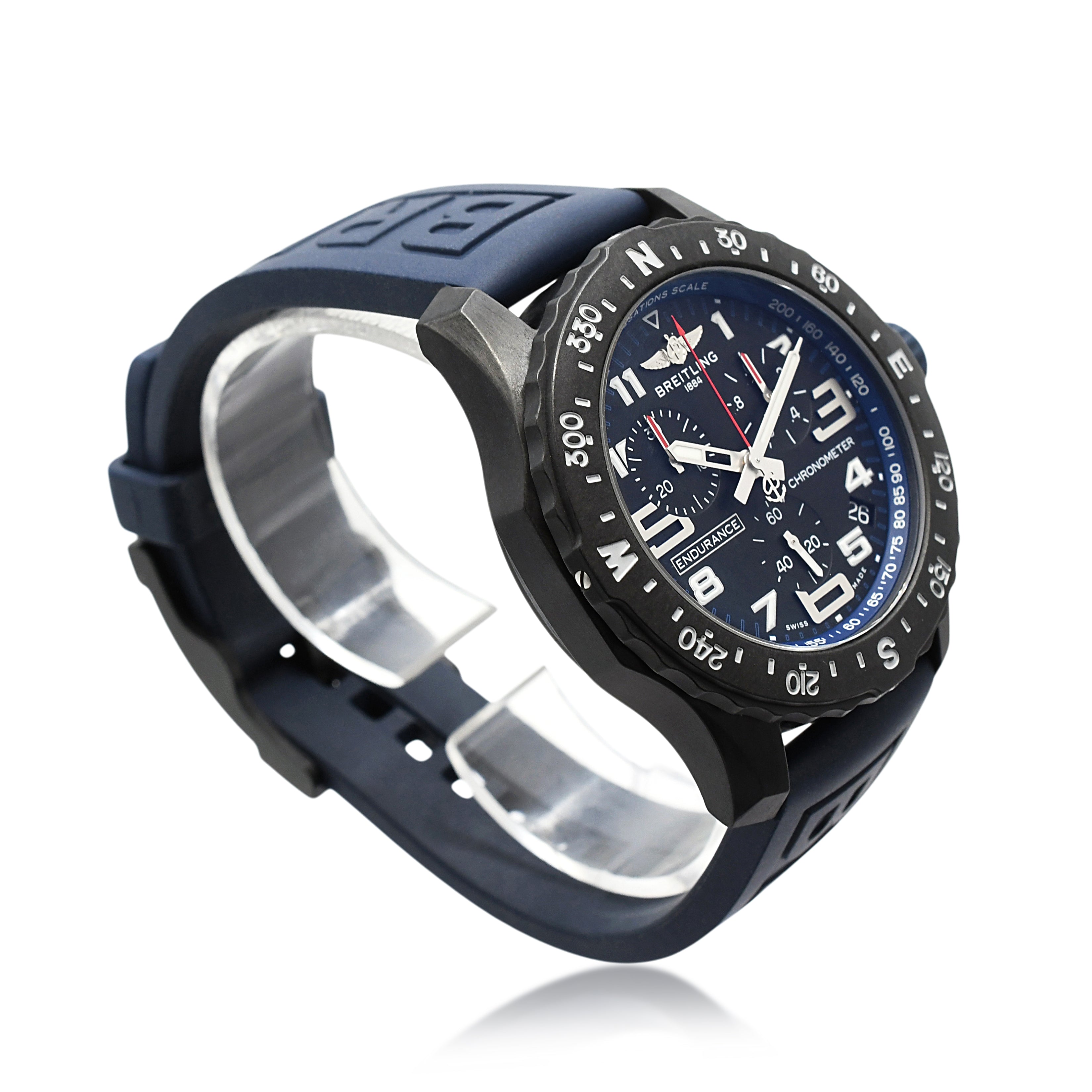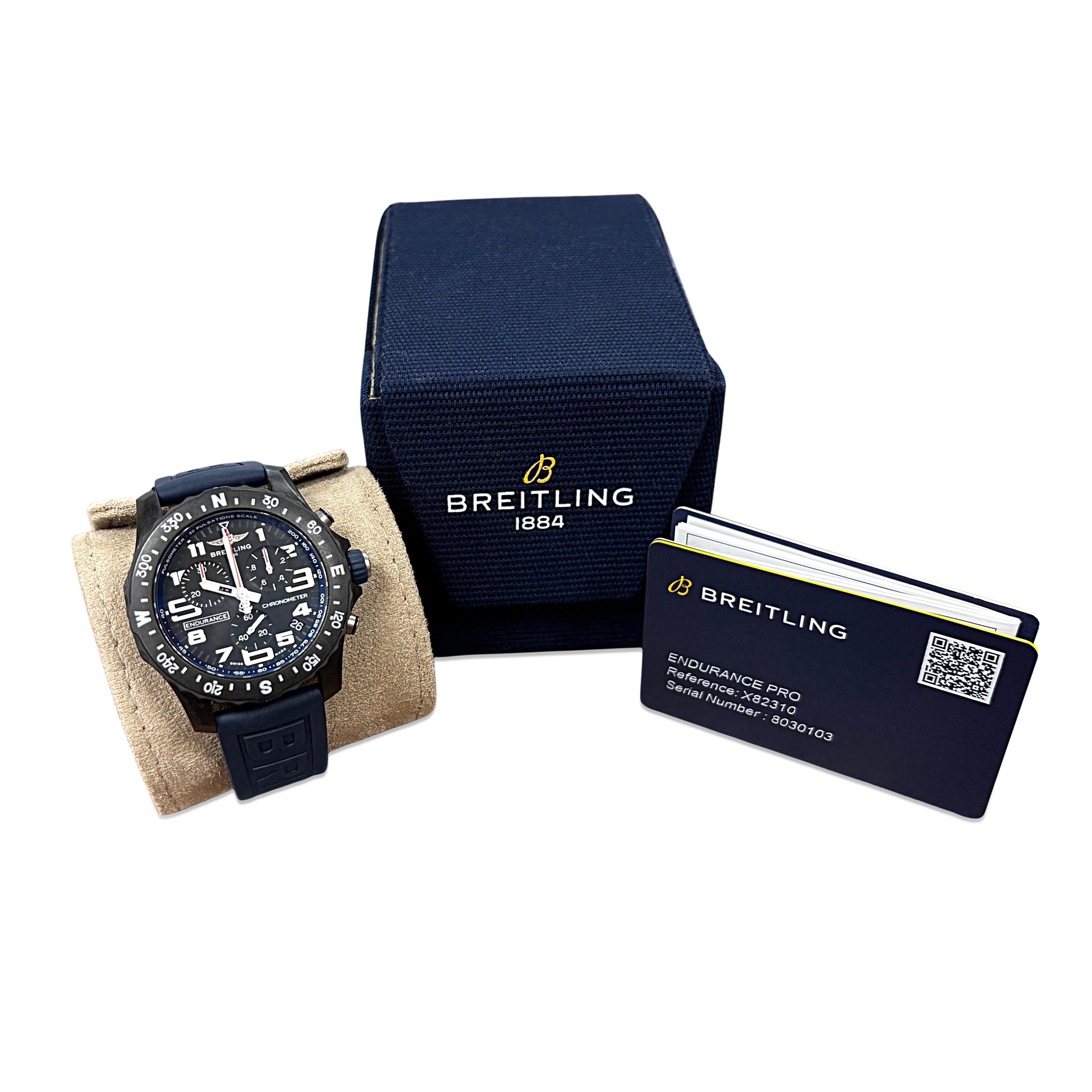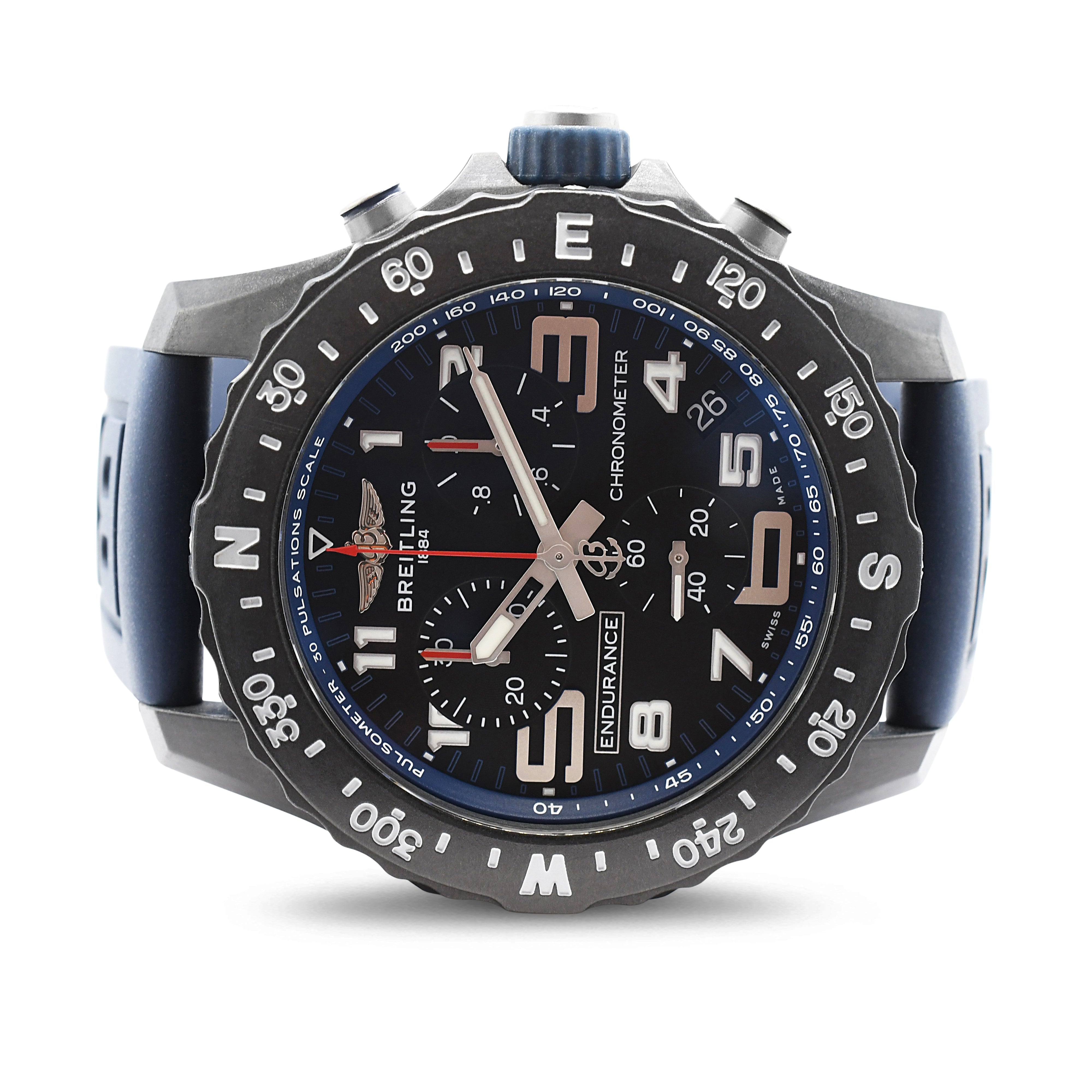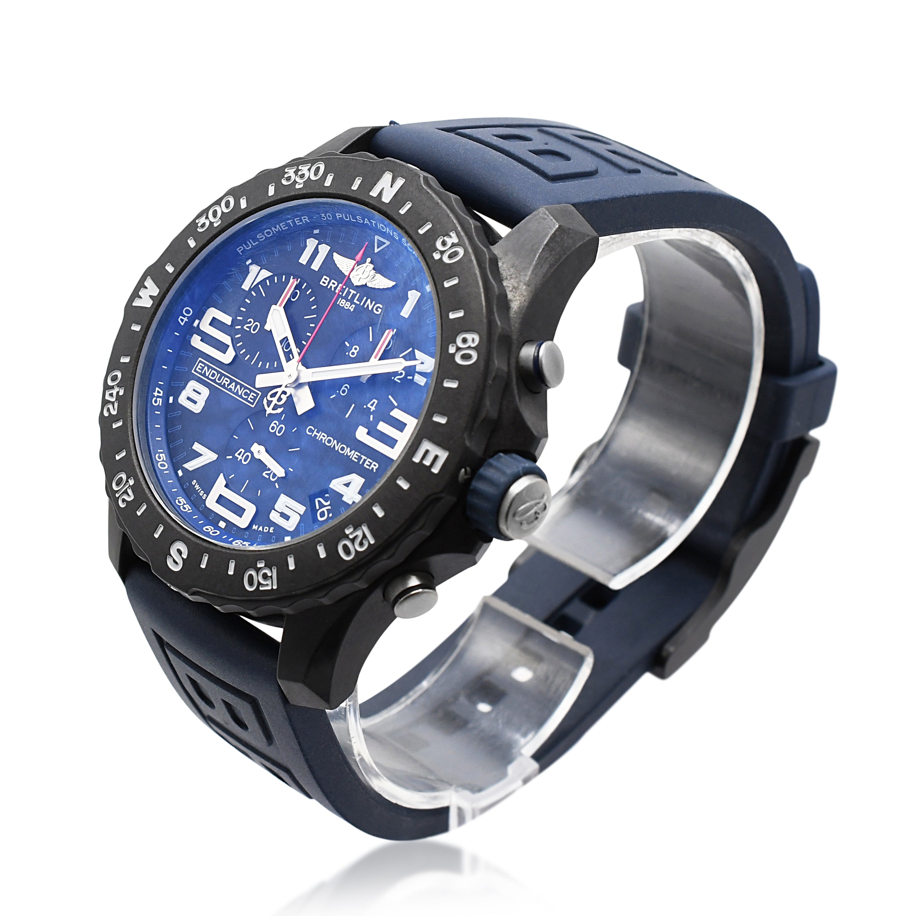 The Breitling Endurance Pro represents cutting-edge sports watch engineering, designed for those who demand durability without compromise. This 44mm timepiece features Breitlight™ case material—a proprietary composite that's 3.3 times lighter than titanium yet exceptionally robust—making it ideal for extreme conditions and extended wear. The black dial with blue outer ring pairs perfectly with the striking blue rubber strap, offering both visual appeal and practical grip in wet or demanding environments.