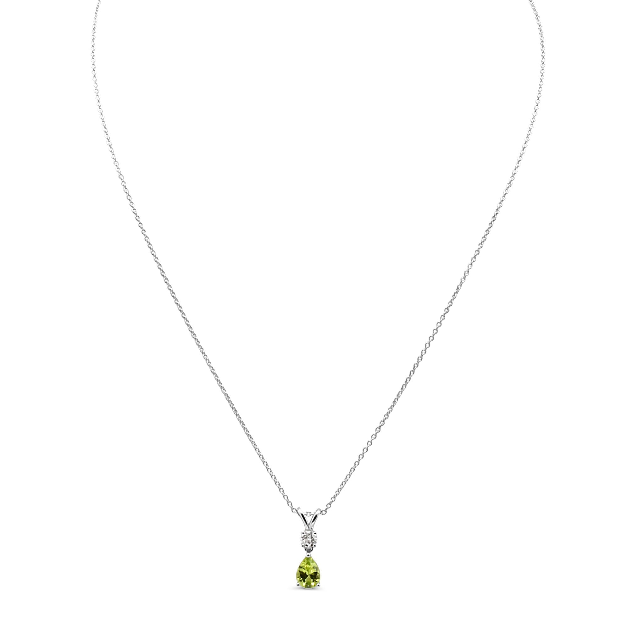 This elegant pendant necklace combines the luminous charm of peridot with a brilliant-cut diamond, creating a refined piece perfect for everyday sophistication. The approximately assessed 0.23ct diamond, in house graded at SI1/2 clarity & I/J colour, pairs beautifully with the vibrant pear cut peridot stone.