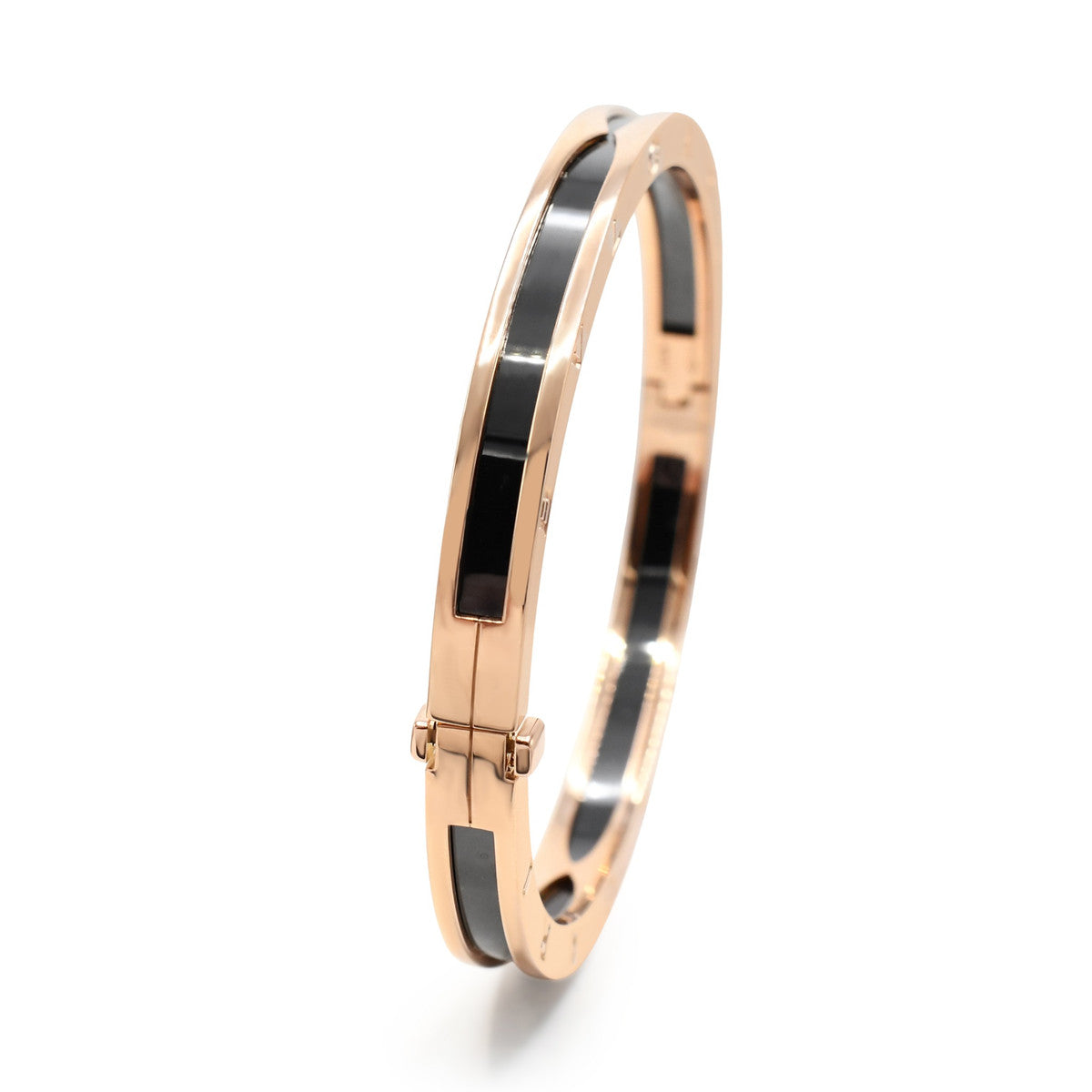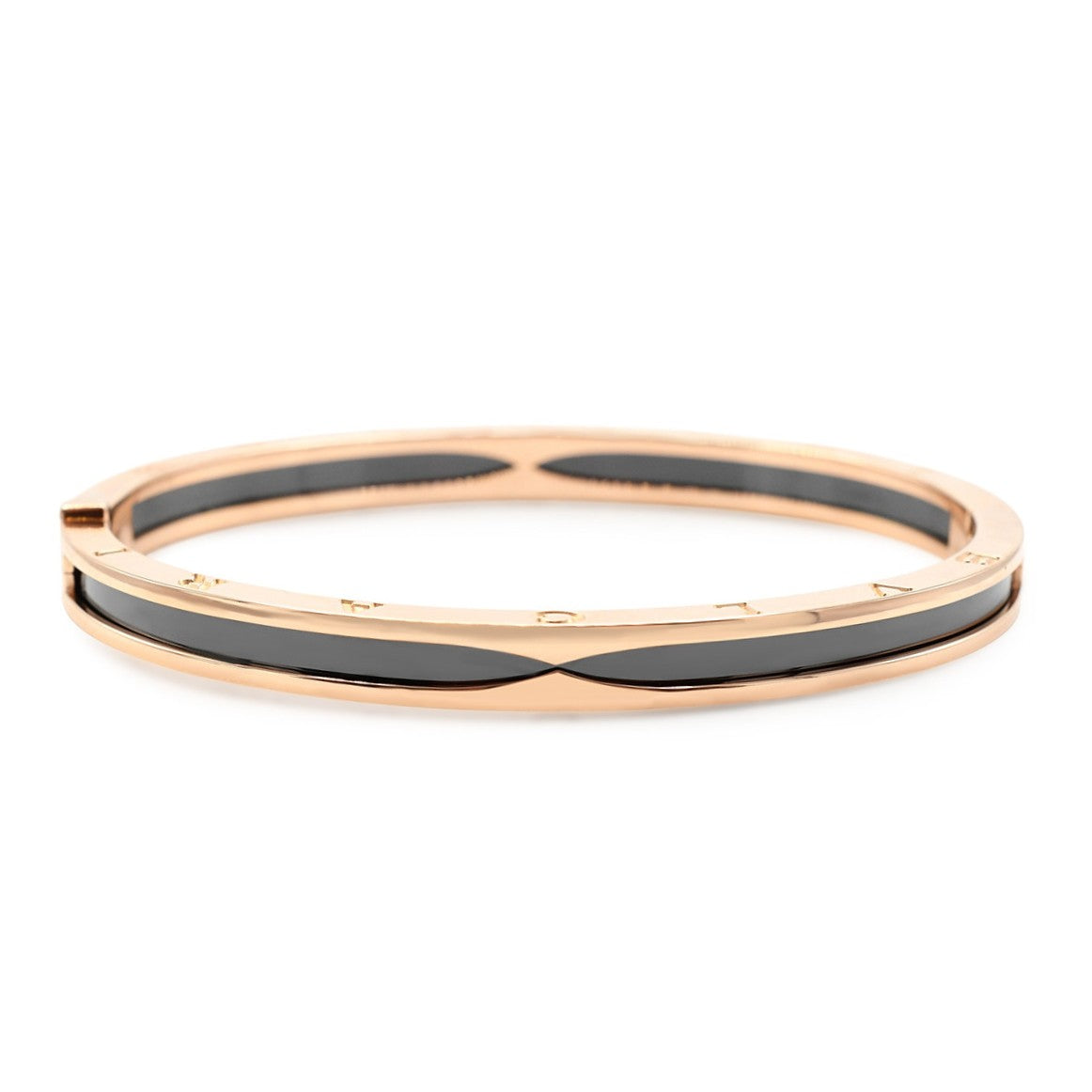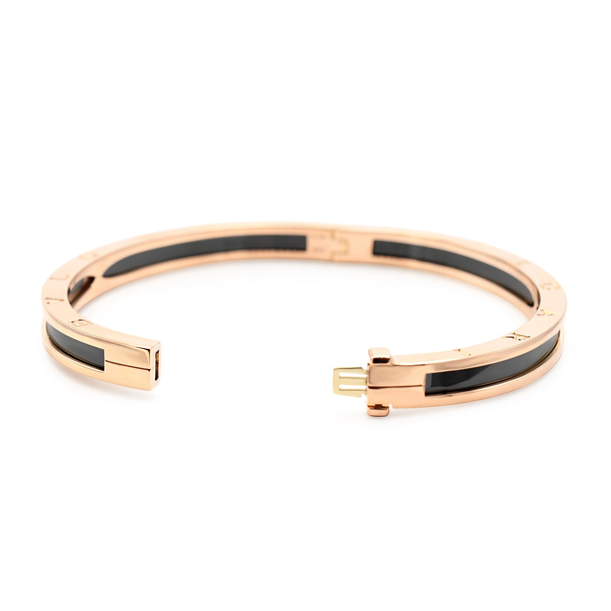 The iconic B.Zero1 bangle reimagined with luxurious rose gold and striking black ceramic detailing. This timeless Bvlgari design features the signature spiral motif that defines the collection, crafted in 18ct rose gold with Italian hallmarks.