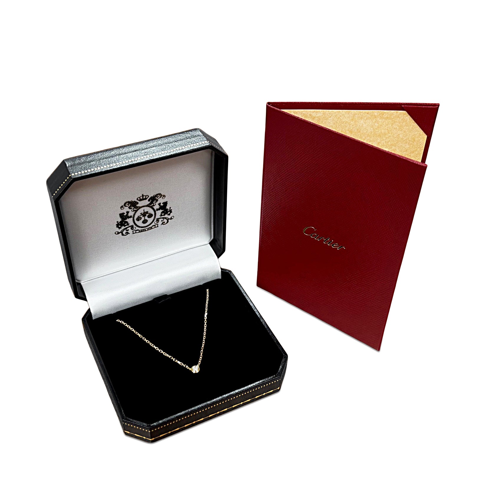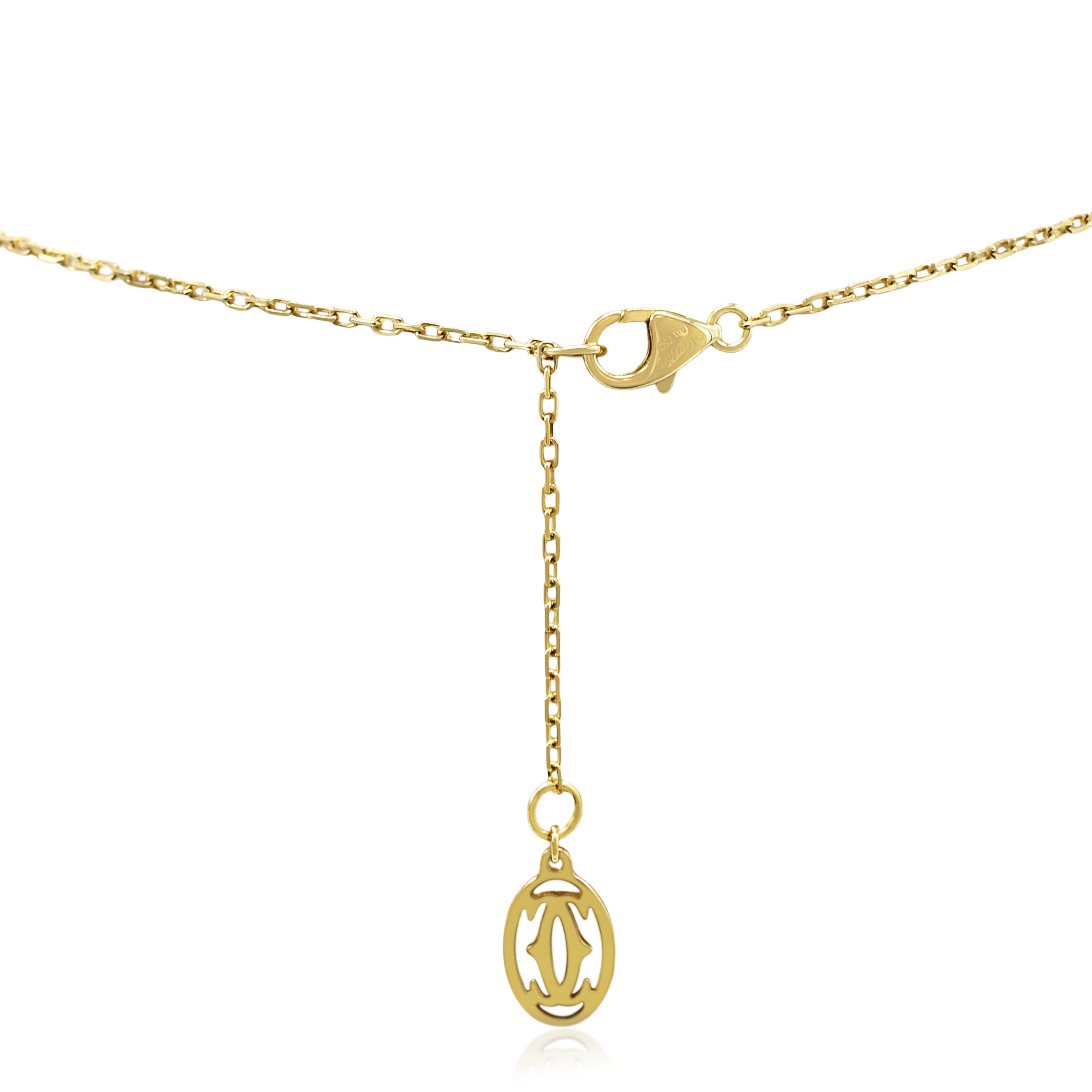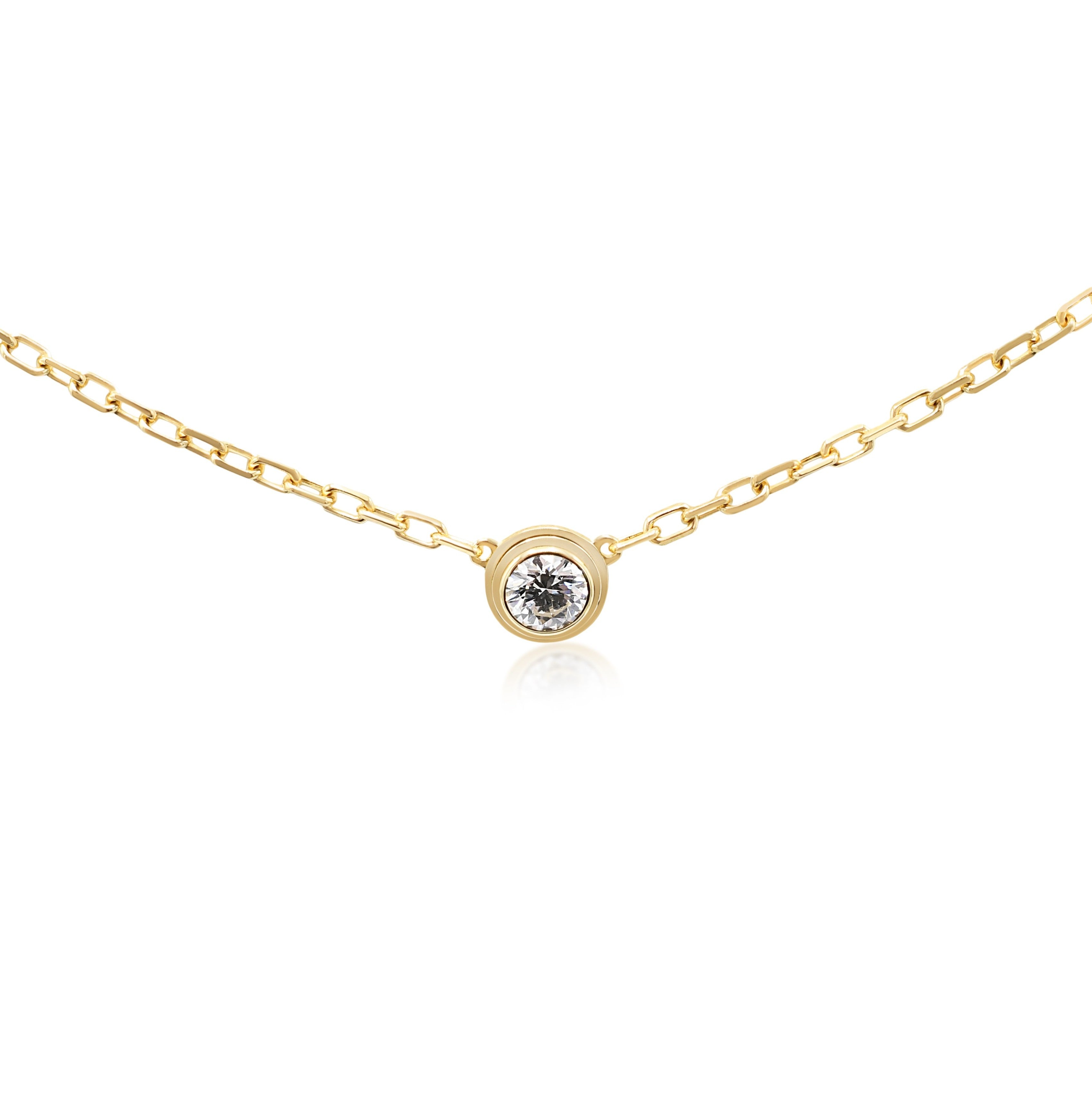 Cartier's iconic d'Amour pendant necklace in 18ct yellow gold, featuring a brilliant-cut diamond (0.09cts) set in the signature small model design. The delicate 4.5mm motif suspends from an adjustable chain offering versatile lengths of 38cm or 41cm, perfect for layering or solo wear.