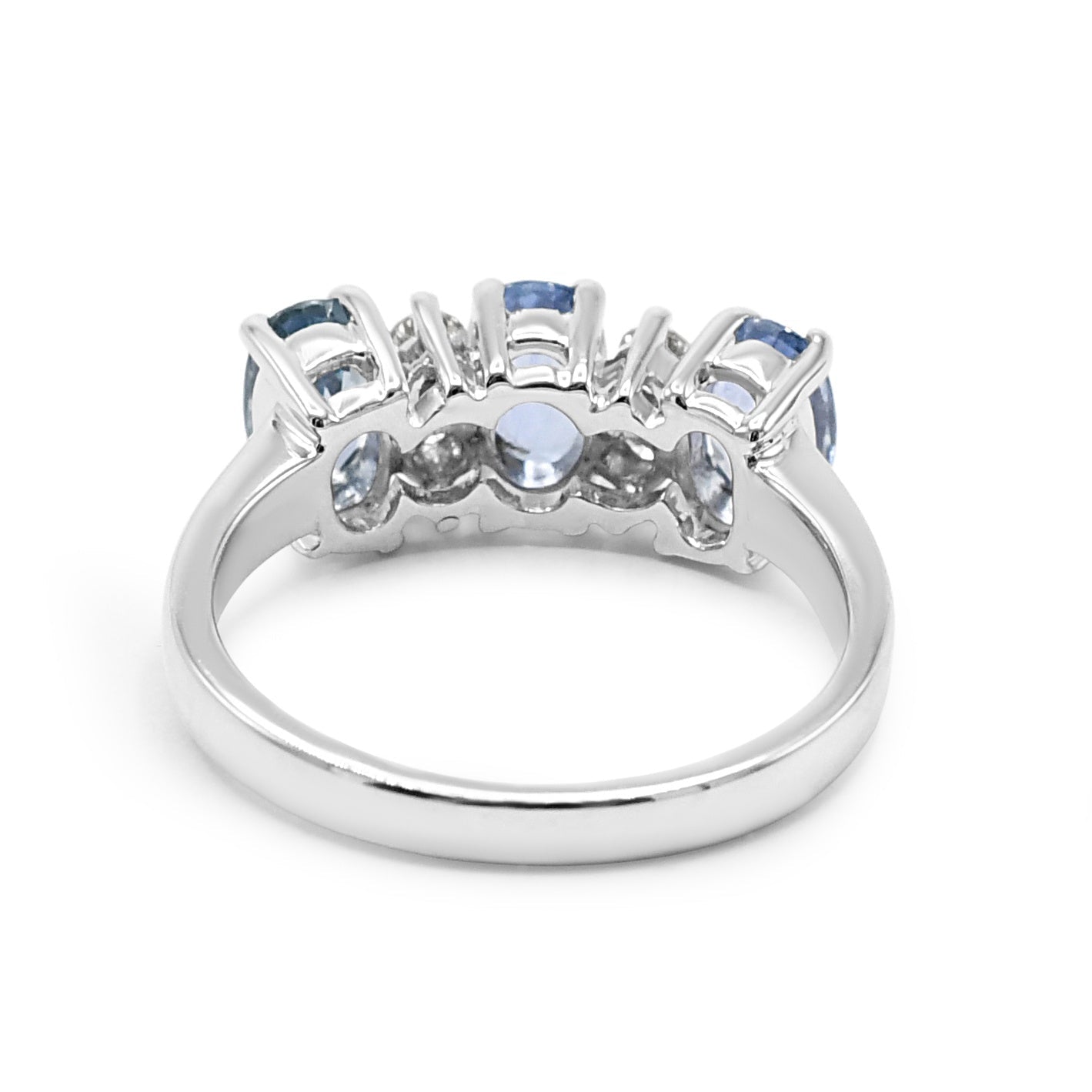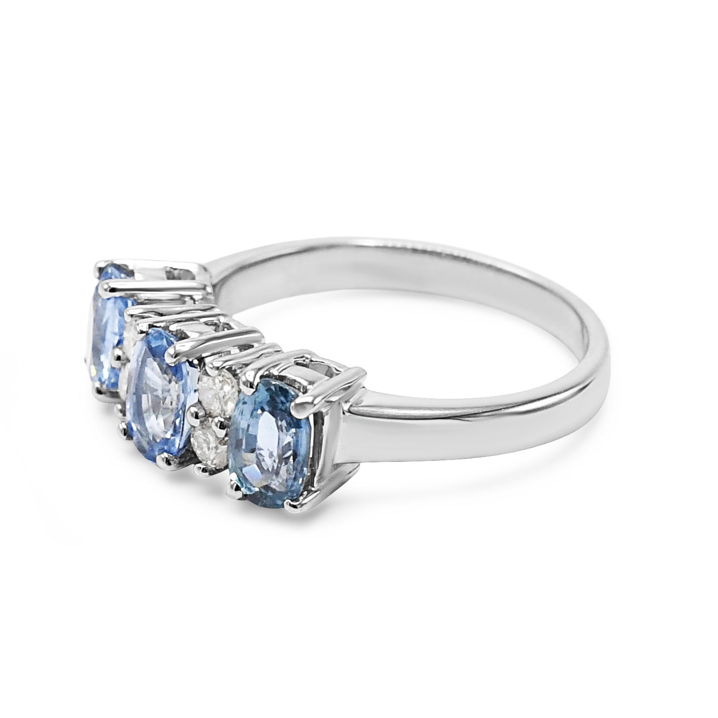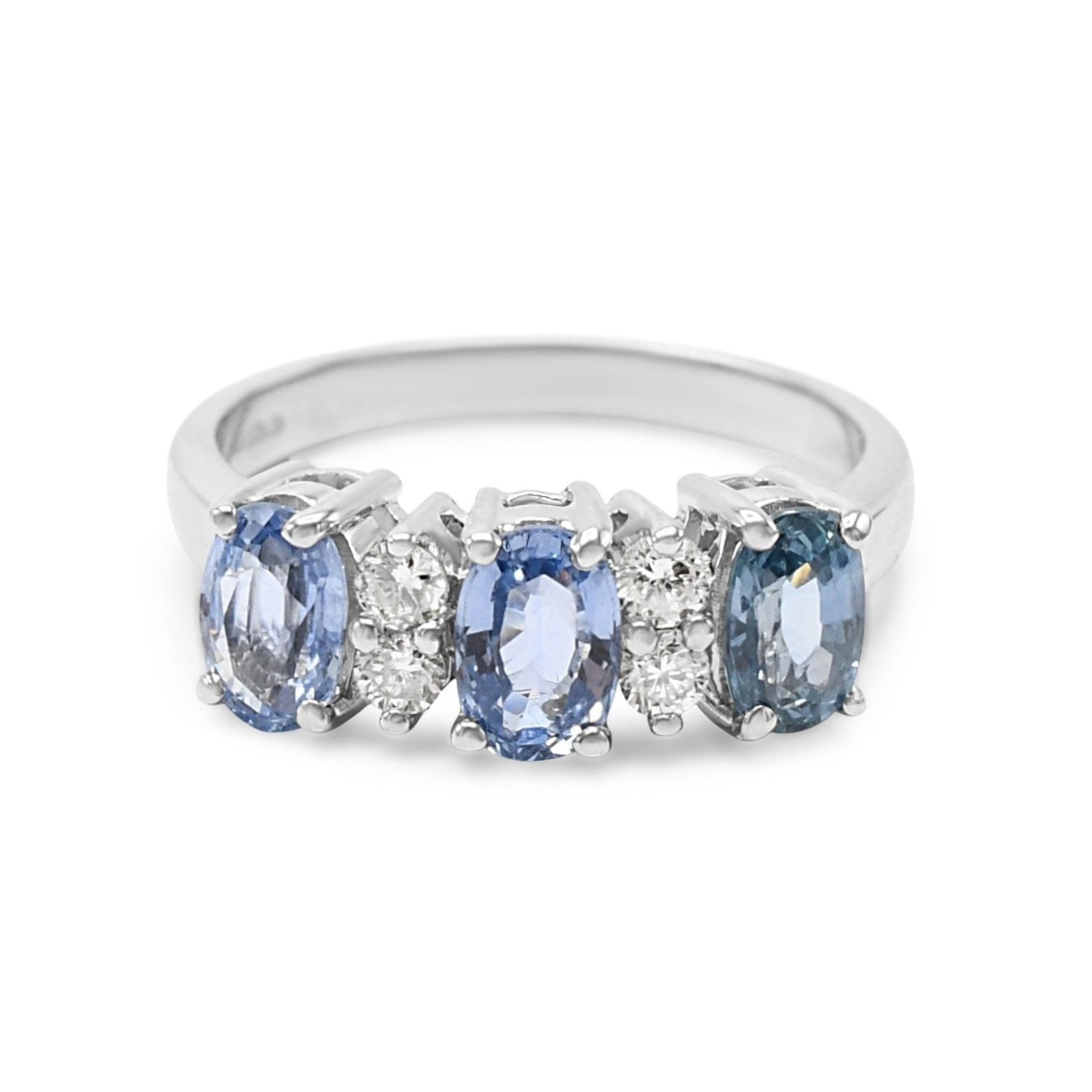 This exquisite ring showcases a harmonious blend of brilliance and colour, featuring a stunning cluster of oval sapphires totalling approximately 1.10 carats, complemented by  sparkling diamonds weighing around 0.24 carats.