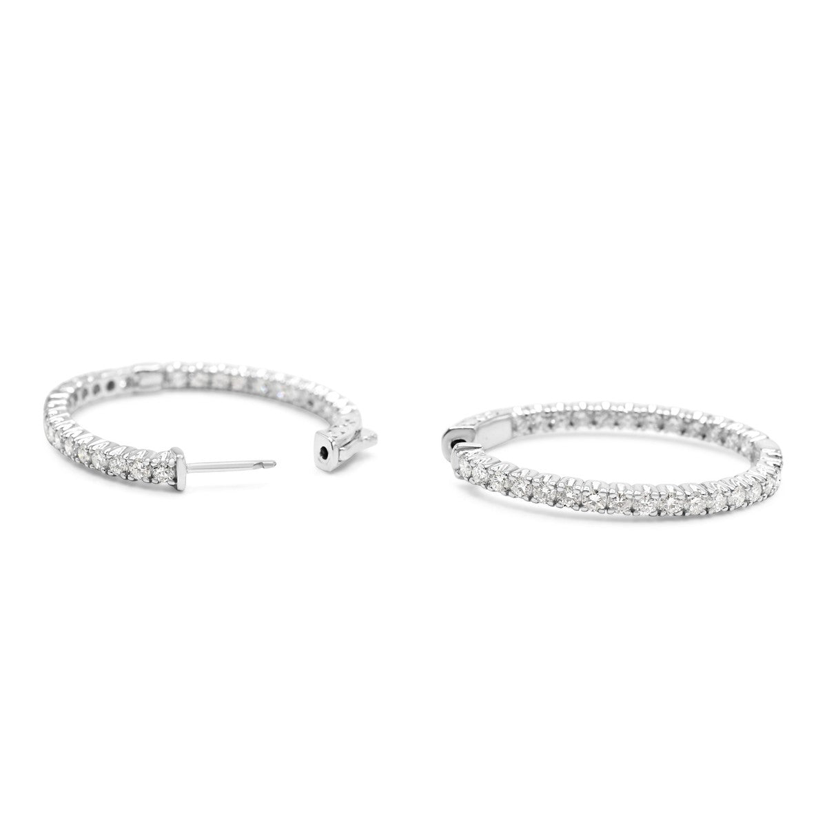 Elegant brilliant cut diamond hoop earrings, featuring approximately 2.90 carats of sparkling diamonds set in a timeless design. Each earring measures 35 x 28mm, offering a sophisticated statement piece that catches the light beautifully.