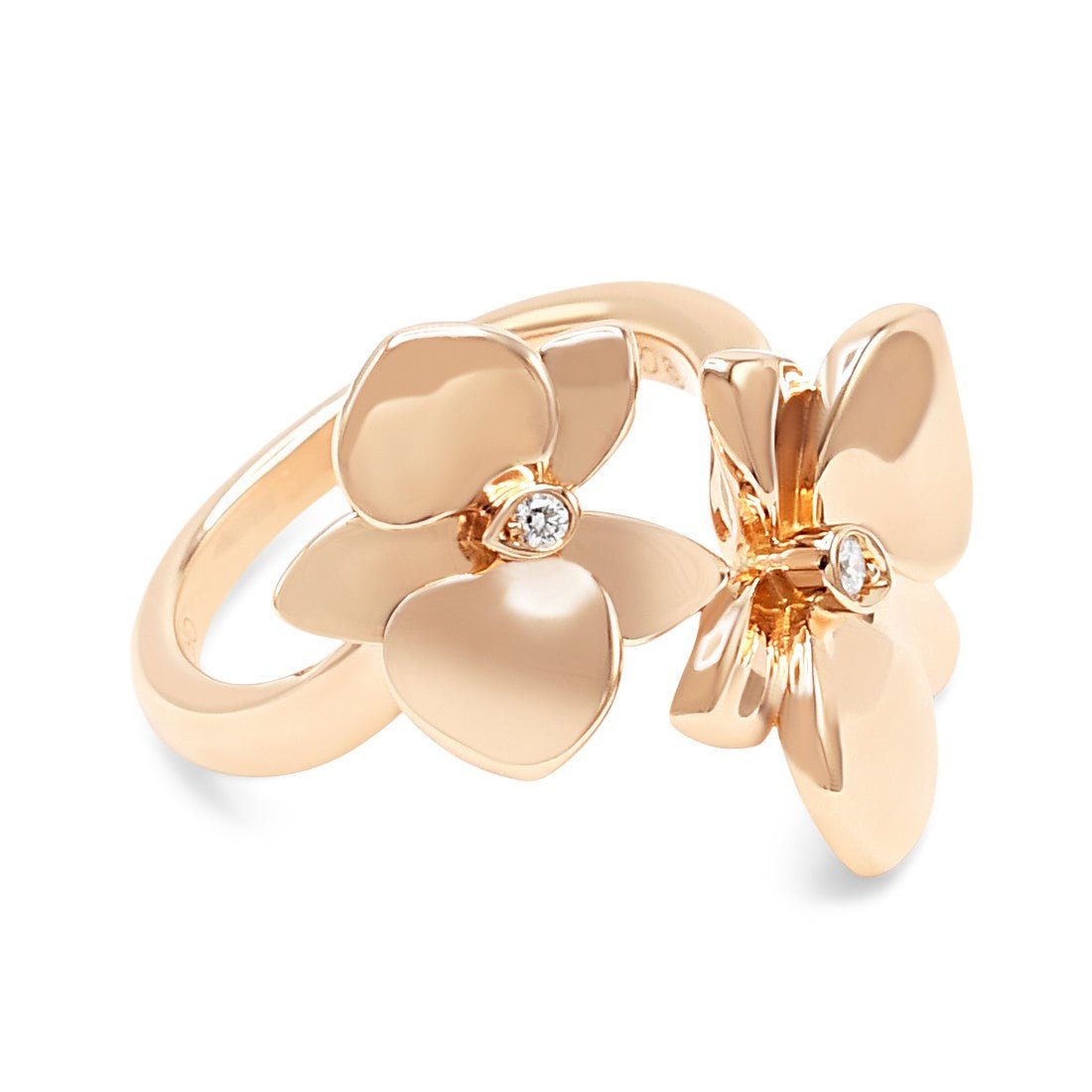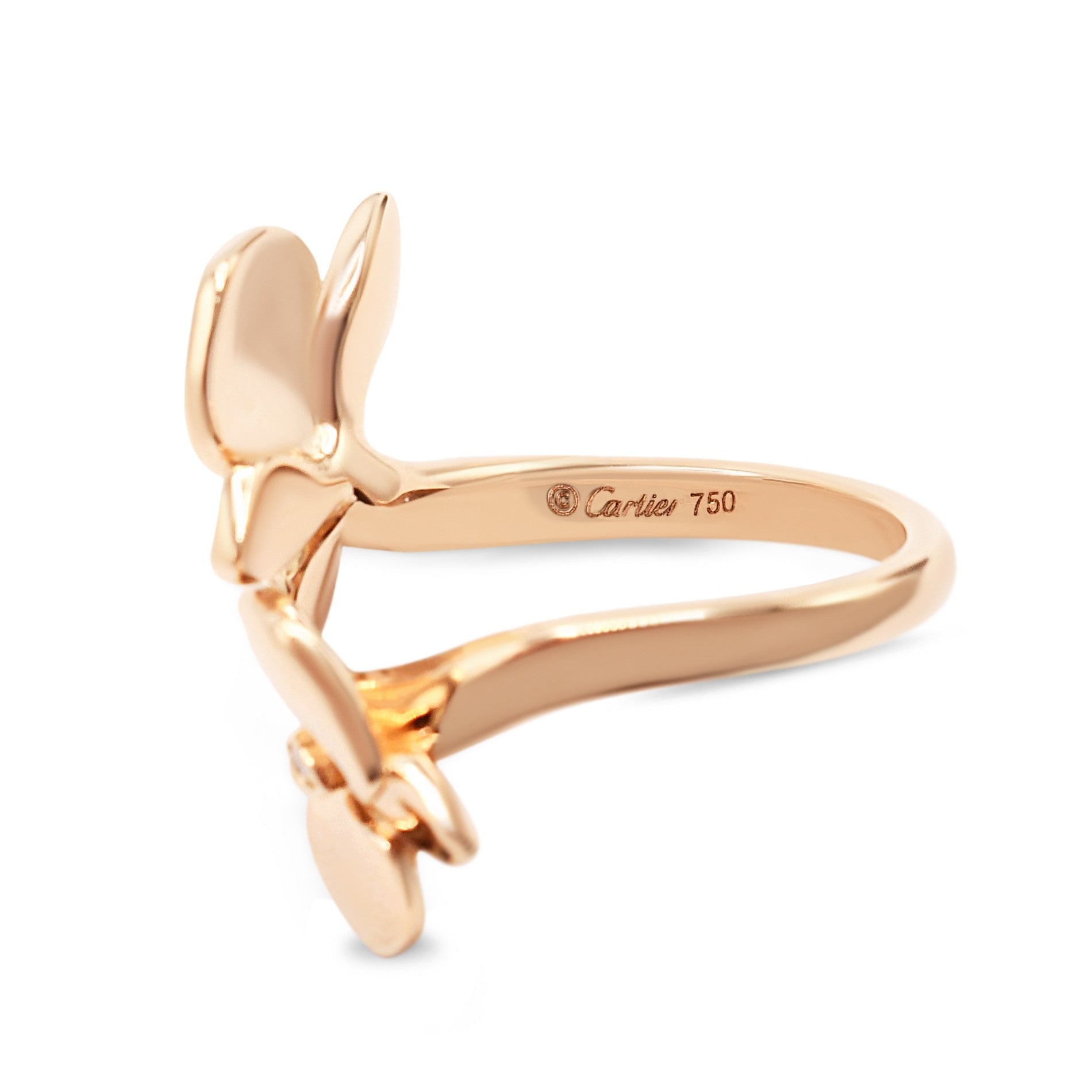 Discover timeless elegance with this exquisite Cartier Caresse d'Orchidées ring, crafted in luxurious 18ct rose gold. Featuring an enchanting orchid design spanning approximately 23mm, this sophisticated piece showcases diamond-set detailing that captures light beautifully.