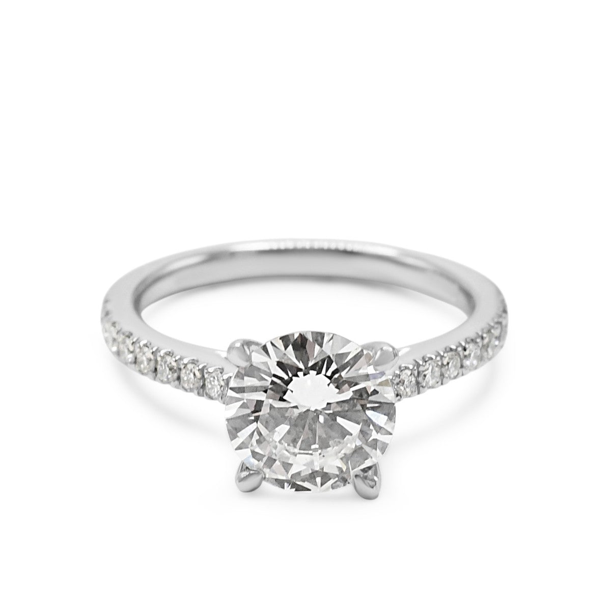 This exquisite solitaire diamond ring showcases a stunning 1.72-carat diamond (H colour, VS1 clarity) set in luxurious platinum, certified by De Beers for authenticity and quality. The elegant design features delicate diamond shoulders totalling approximately 0.32 carats, adding refined sparkle and dimension to the band. Ring Size L