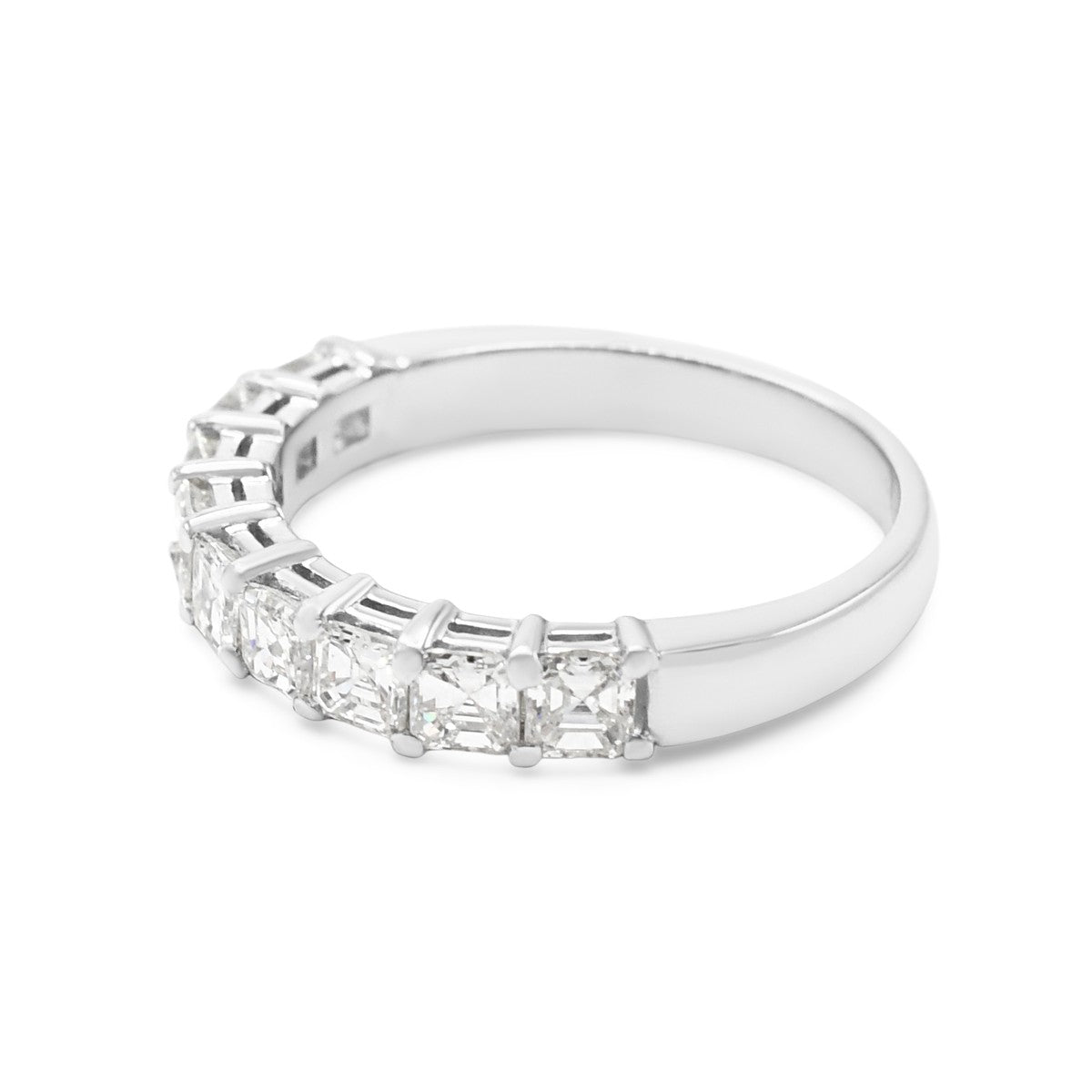 This elegant women's half hoop ring showcases nine brilliant diamonds set in platinum, featuring a striking square emerald cut as its centrepiece. With an approximate total diamond weight of 1.24 carats, the stones are graded at an estimated F colour and VS1 clarity, ensuring exceptional sparkle and brilliance.