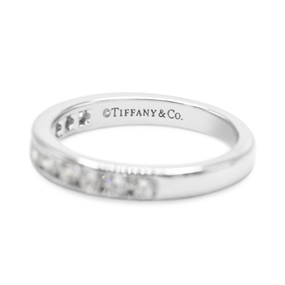 An exquisite Tiffany & Co. platinum ring from 2014, featuring a graceful half-circle of diamonds totalling 0.33 carats. The refined 3mm design showcases brilliant sparkle with timeless elegance, sized K and weighing 4.8g.