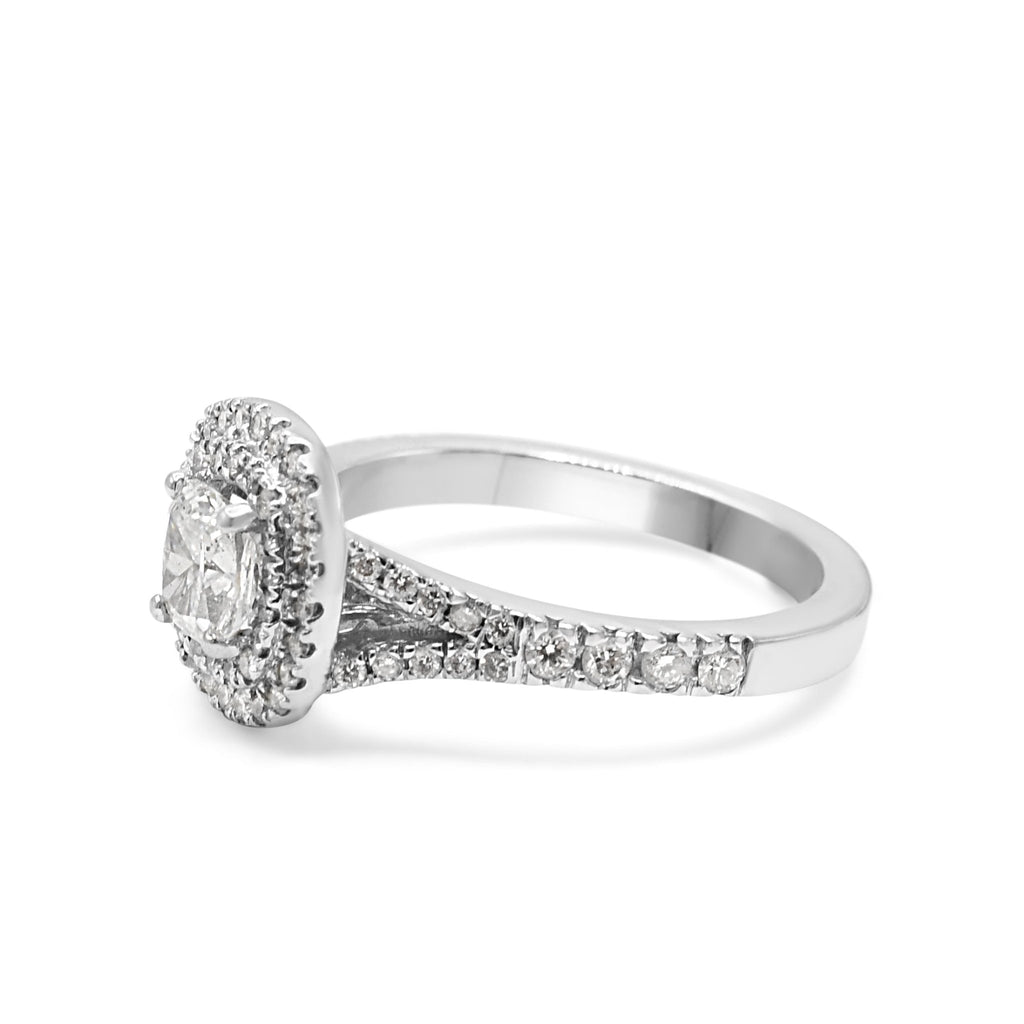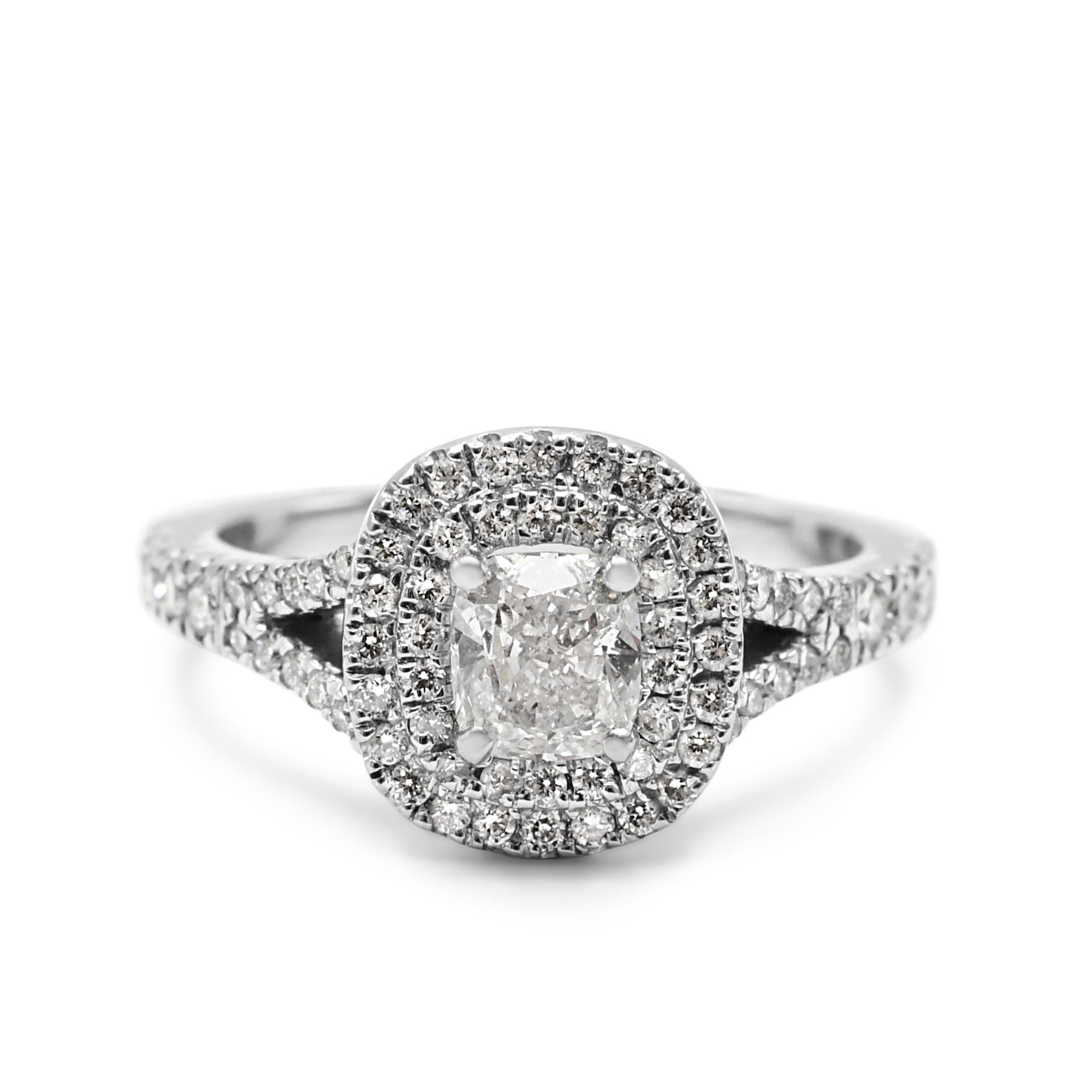 As you slip this pre-owned ring onto your finger, you'll immediately feel its weight of 5.88g, assuring you of its superior quality and durability. The attention to detail and impeccable craftsmanship is evident in every aspect of this used ring, from the stunning cushion cut Diamond to the intricate details of the 2 row cluster design.
