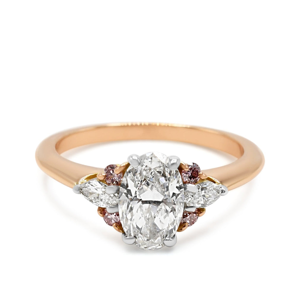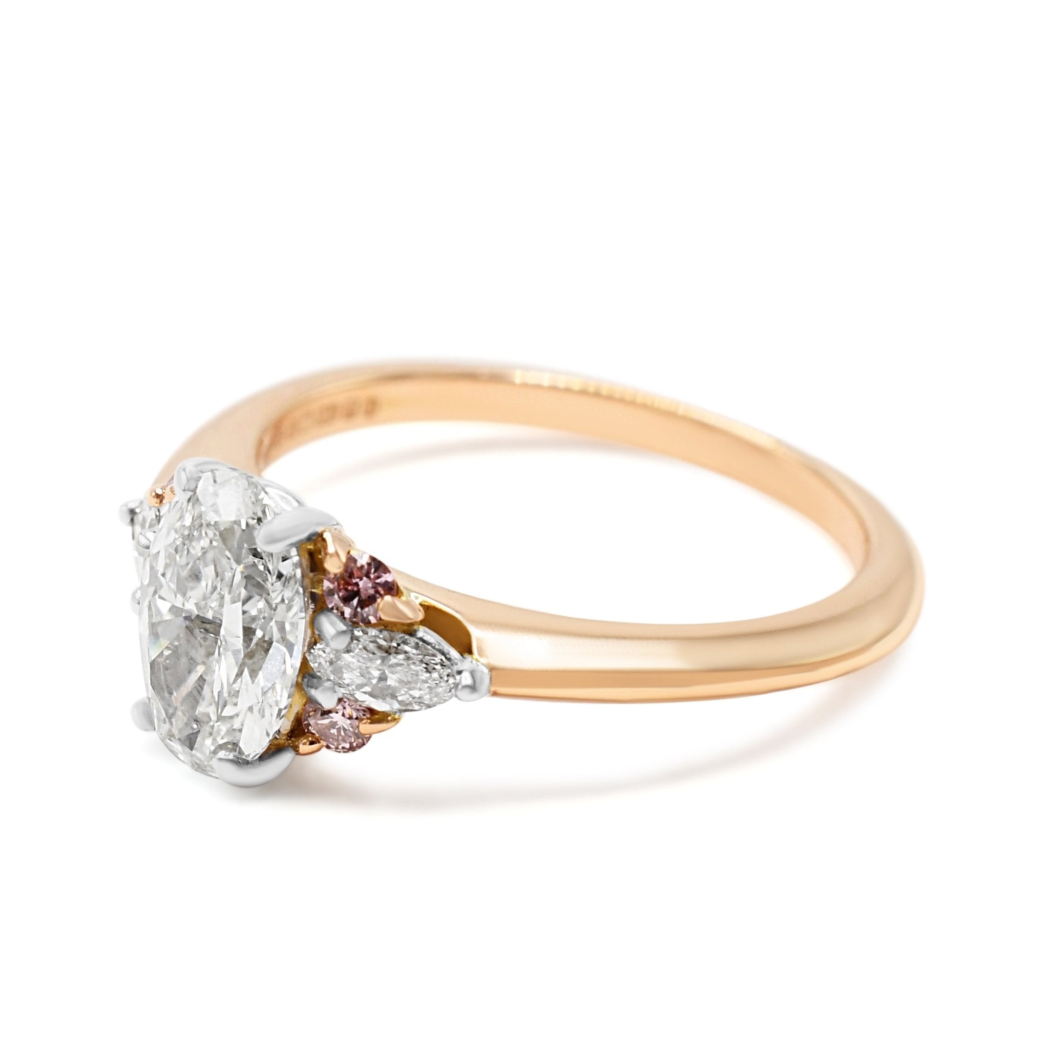 As you slip this stunning ring onto your finger, you'll feel the expertly cut and polished 1.02ct Diamond Centre Stone radiate with brilliance. The Oval Cut not only elongates your finger, but also accentuates the mesmerizing beauty of the stone. But that's not all, the Round Brilliant and Marquise Cut Diamonds adorning the shoulders add a touch of glamour and luxury to the overall design.